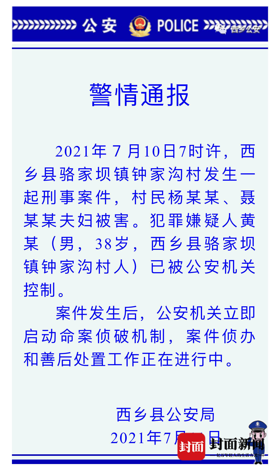 7月11日,账号“西乡公安”通过官方微信公众号回复该事件。警情通报内容为:2021年7月10日7时许,西乡县骆家坝镇钟家沟村发生一起刑事案件,村民杨某某、聂某某夫妇被害。犯罪嫌疑人黄某(男,38岁,西乡县骆家坝镇钟家沟村人)已被公安机关控制。案件发生后,公安机关立即启动命案侦破机制,案件侦办和善后处置工作正在进行中。