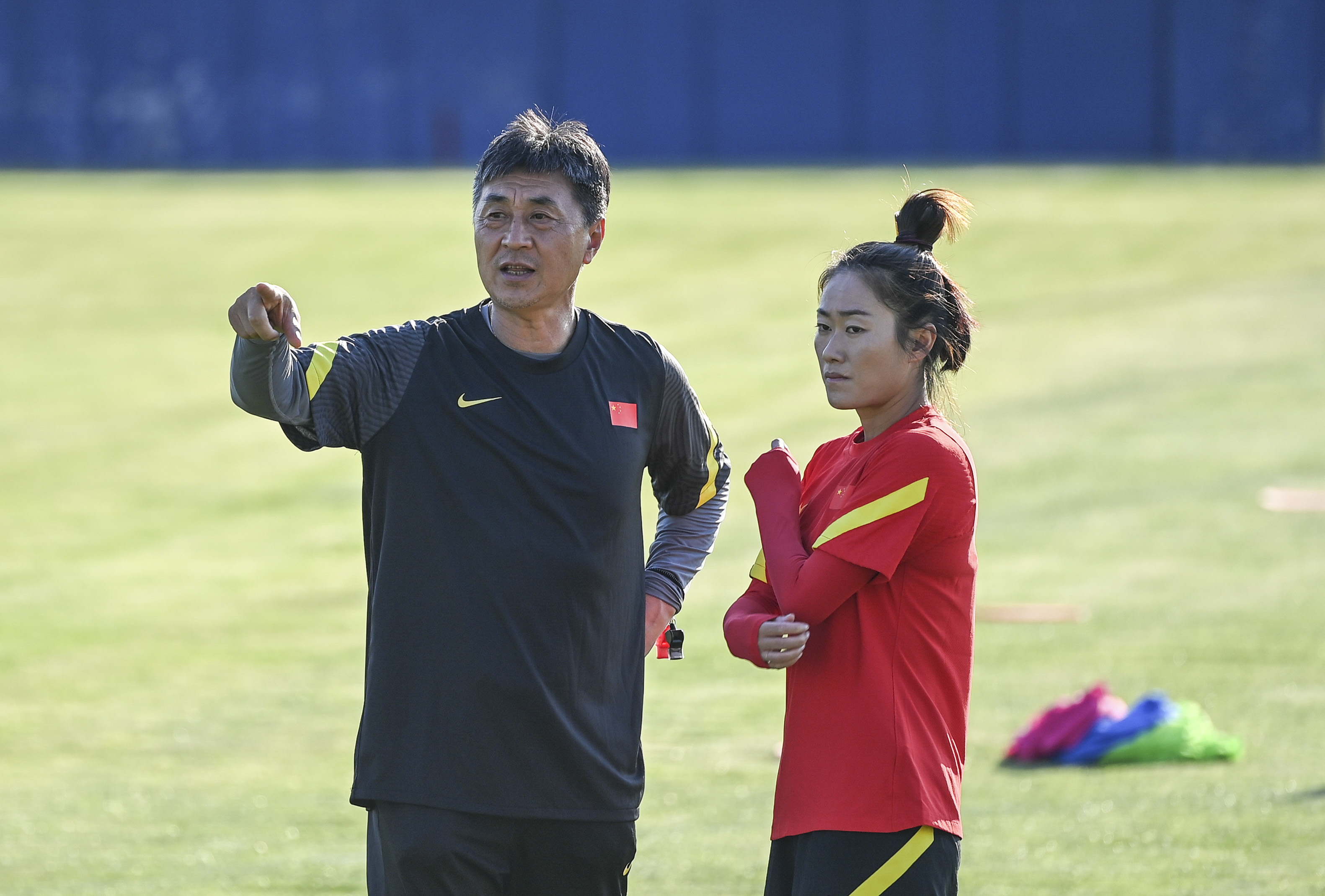 7月19日,中国女足主帅贾秀全(左)在训练中与队长吴海燕交谈。新华社记者 逯阳 摄