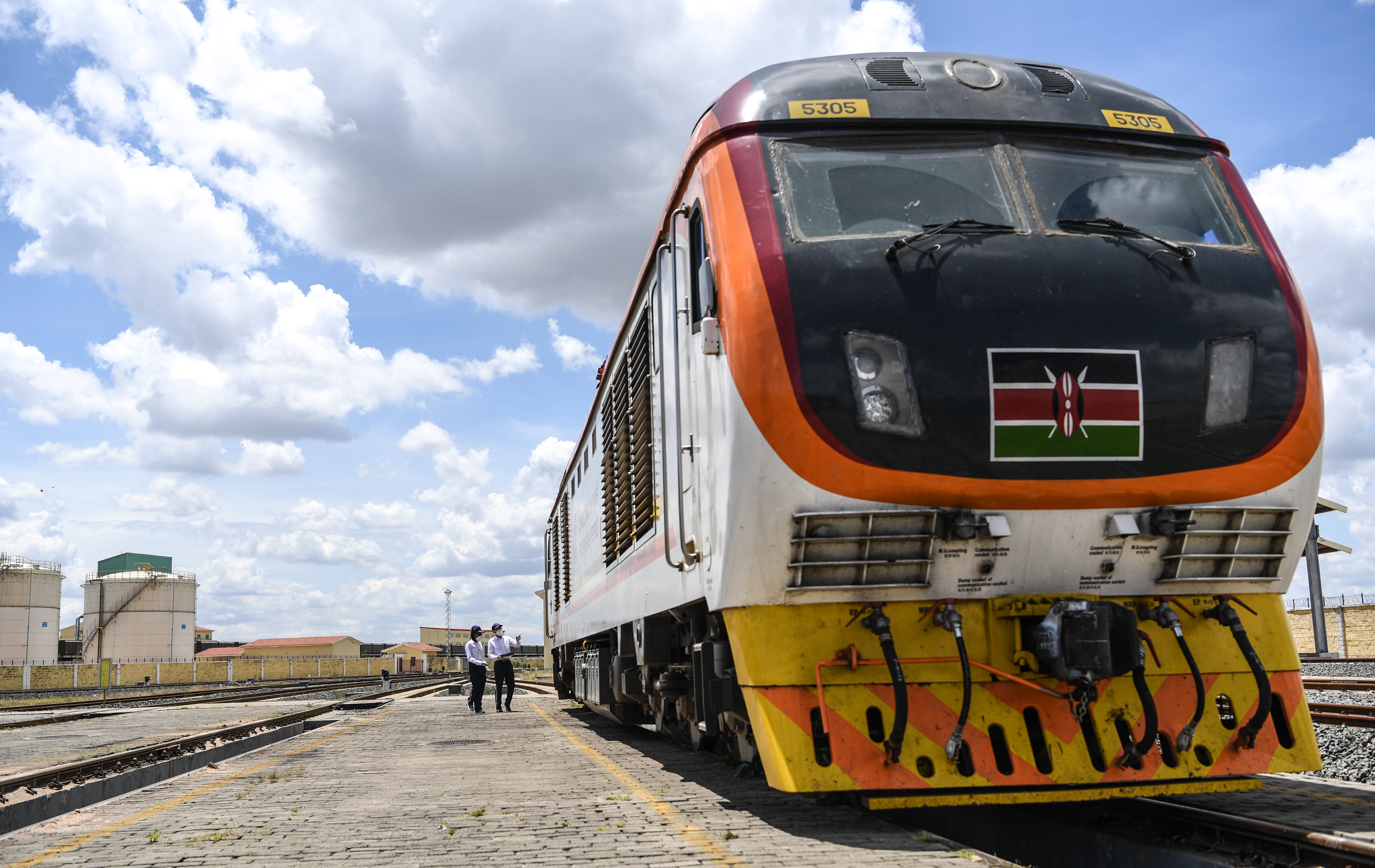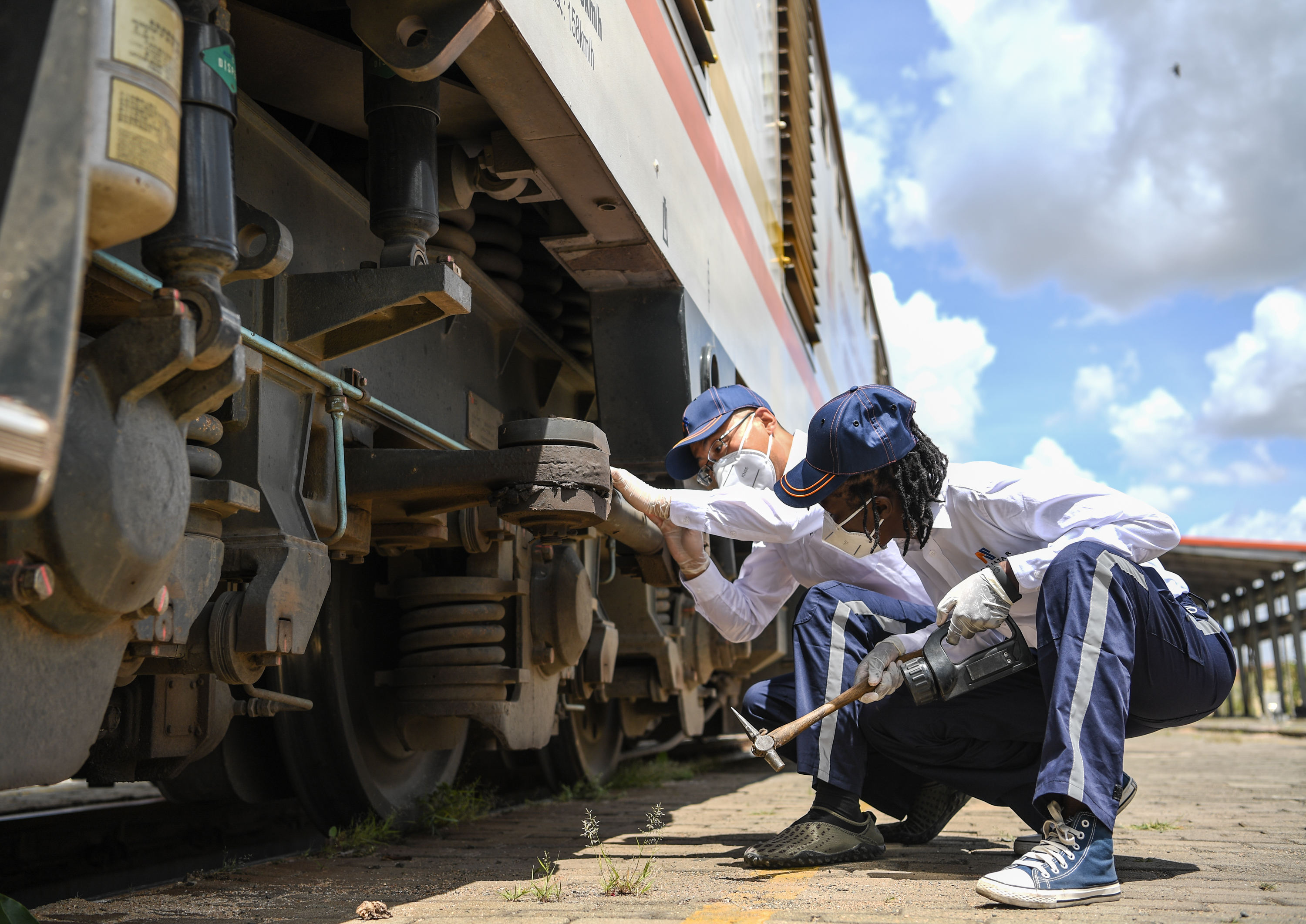 在肯尼亚首都内罗毕,蒙内铁路指导司机杨明和他的肯尼亚女徒弟康西莉亚在检查机车。新华社记者李琰摄