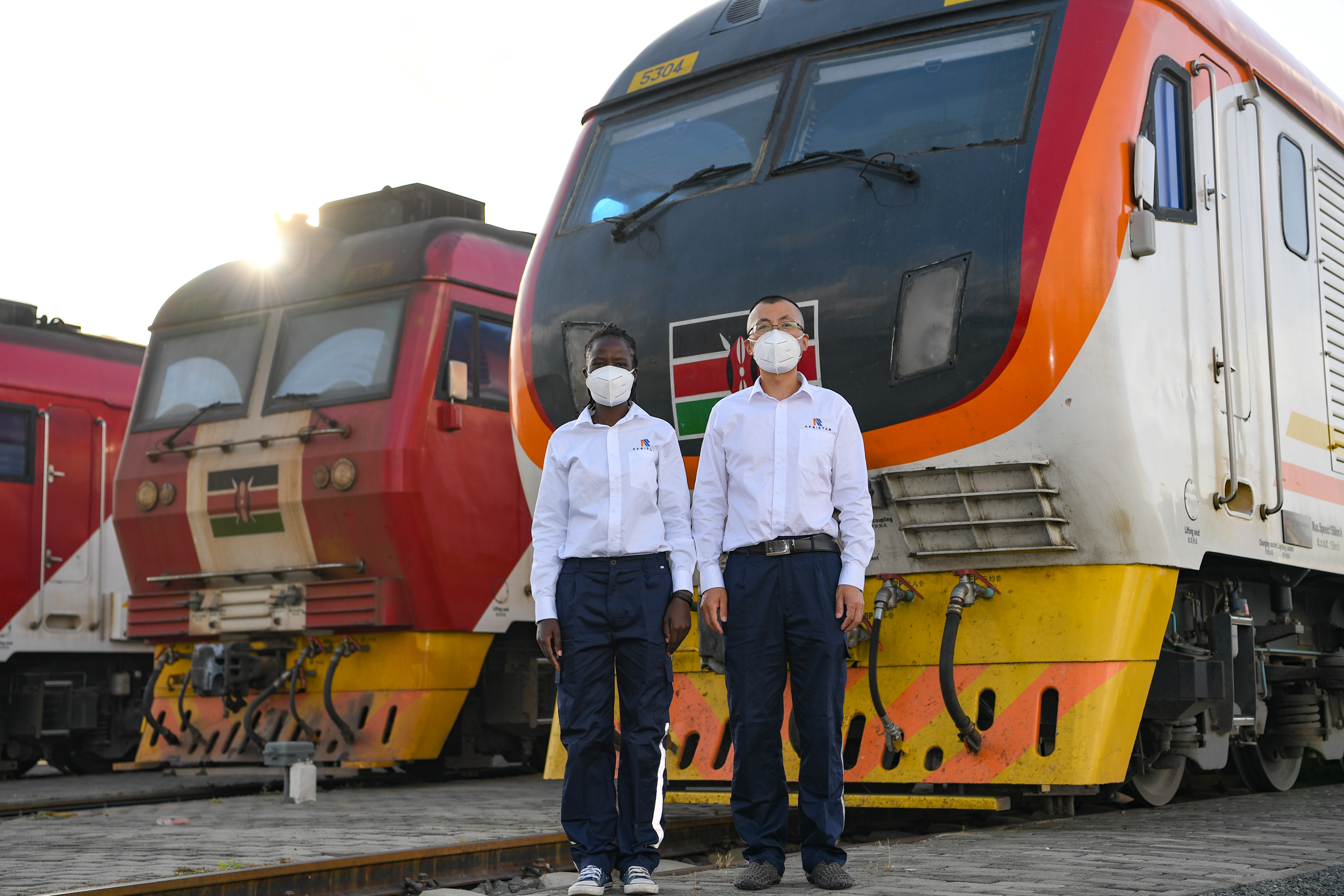 在肯尼亚首都内罗毕,蒙内铁路指导司机杨明和他的肯尼亚女徒弟康西莉亚在机车前合影。新华社记者李琰摄