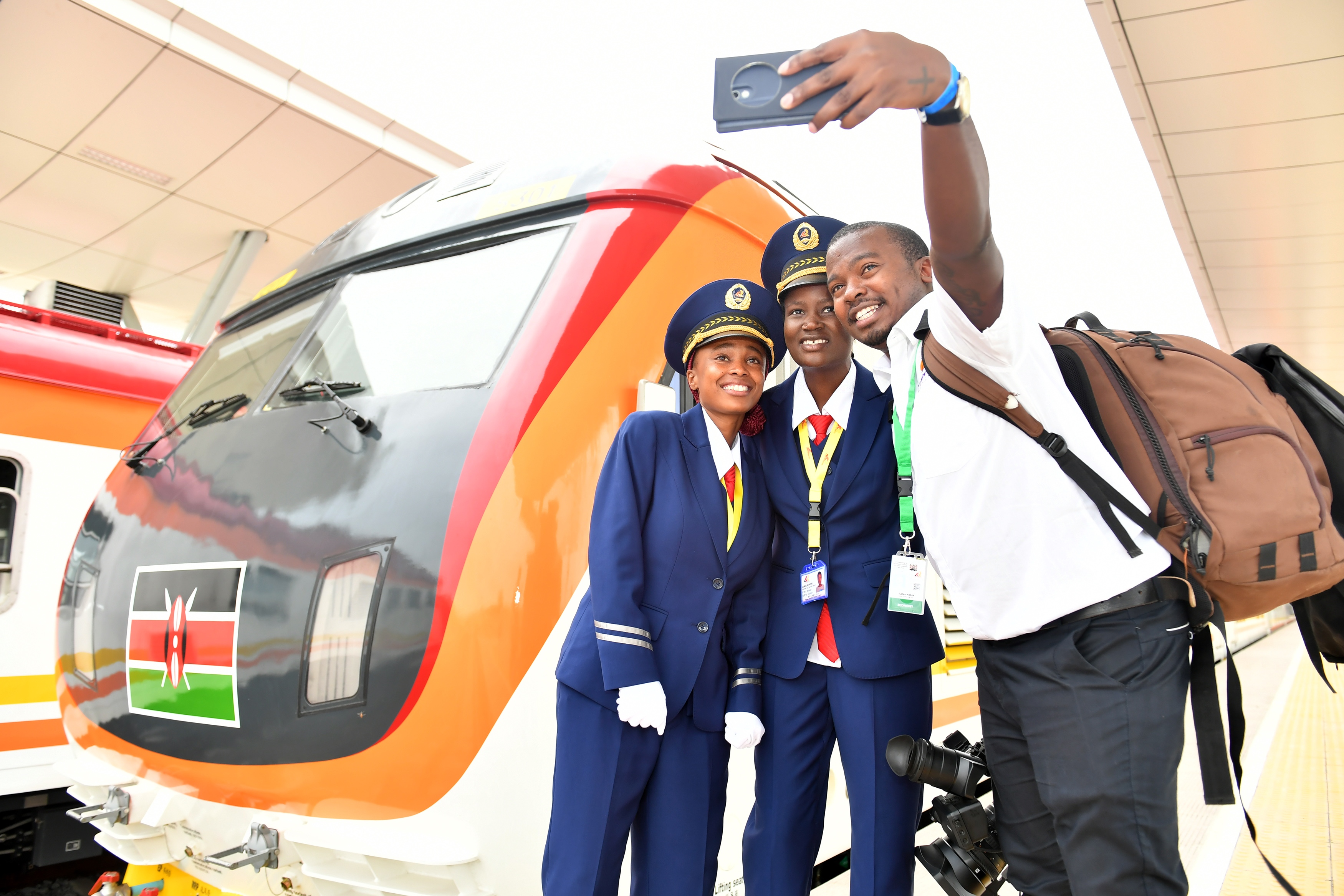 2017年5月31日,由中国企业承建的肯尼亚蒙内铁路正式建成通车。在蒙内铁路蒙巴萨西站,一名肯尼亚记者和火车司机康西莉亚(中)、艾丽斯合影留念。新华社记者孙瑞博摄