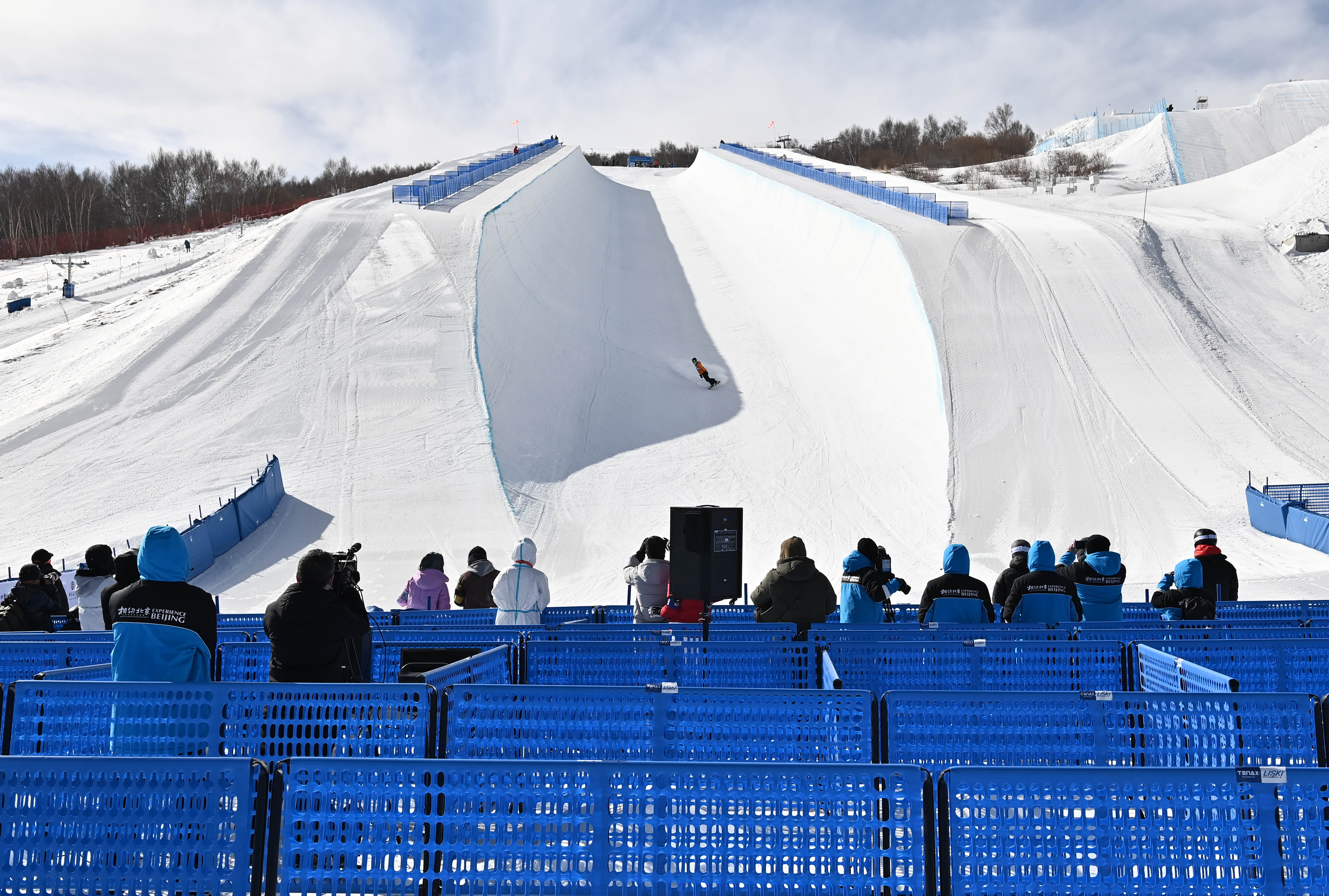 资料图:工作人员在张家口赛区云顶滑雪场U型场地前进行测试。新华社记者贺长山摄