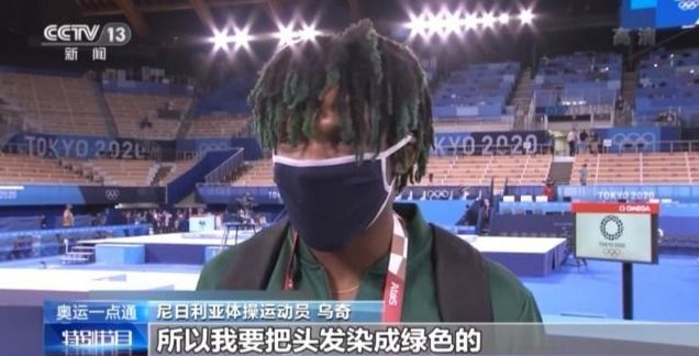 尼日利亚体操运动员 乌奇:绿色和白色代表着尼日利亚,所以我要把头发染成绿色的。介绍一下我自己,我不喜欢读书,我是一个程序员,我喜欢数学、自然科学方面的东西,我特别喜欢体操。