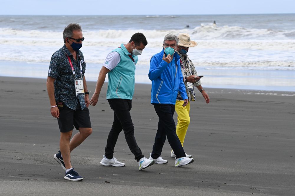 7月27日,国际奥委会主席巴赫(右二)在冲浪比赛现场。新华社记者 杜宇 摄