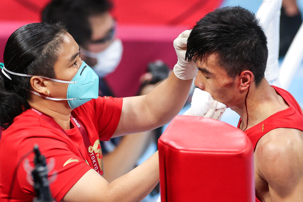 7月31日,中国拳击队教练张喜燕(左)处理胡建关的伤口。新华社记者欧东衢摄