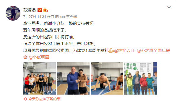 而就在几天前,苏炳添微博晒出一张有9人的“毕业照”,其中有外教兰迪·亨廷顿,为即将开始的奥运田径比赛加油。显然,这个“小分队”就是苏炳添创纪录背后的那些人。