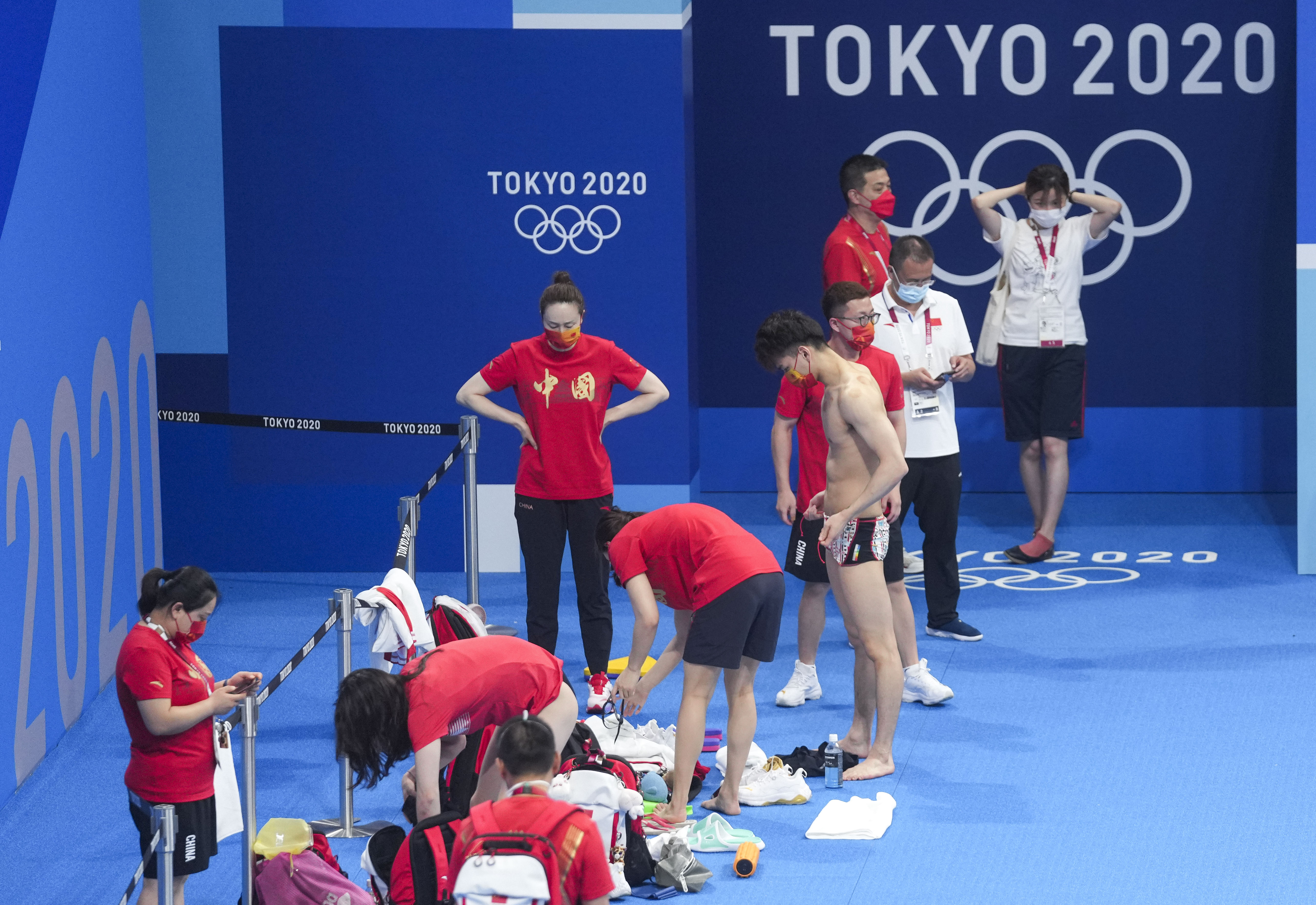 7月21日,中国游泳队队员在场边整备。新华社记者许畅摄