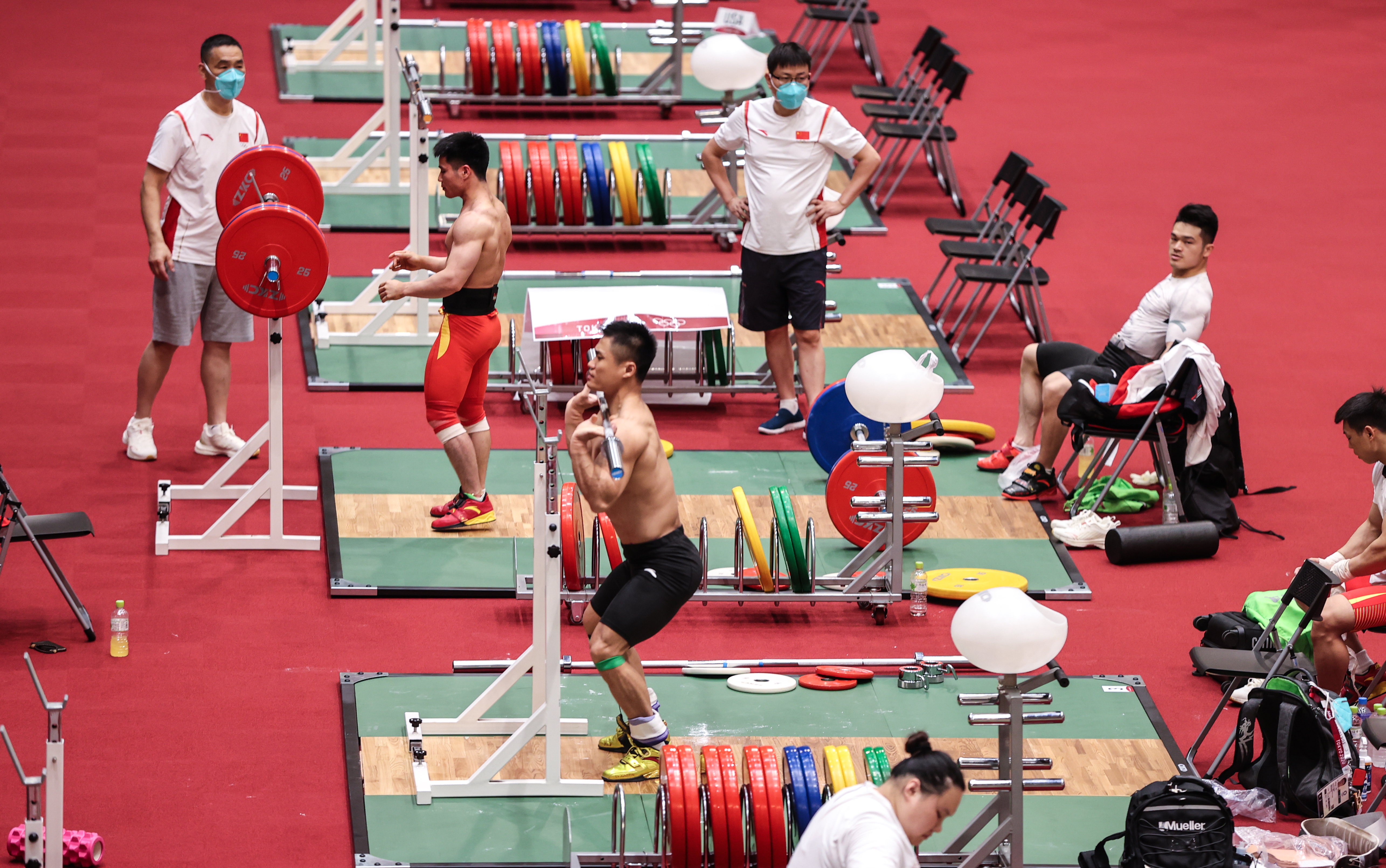 7月20日,中国举重队队员在团队的支援下进行热身训练。新华社记者杨磊摄
