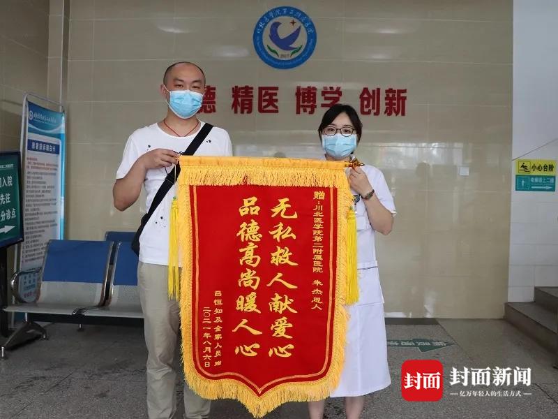 8月6日上午,四川南充,川北医学院第二附属医院门诊大厅,市民吕先生将一面感谢锦旗,送到内科医师朱杰手中,感谢朱医生对他父亲的救命之恩。