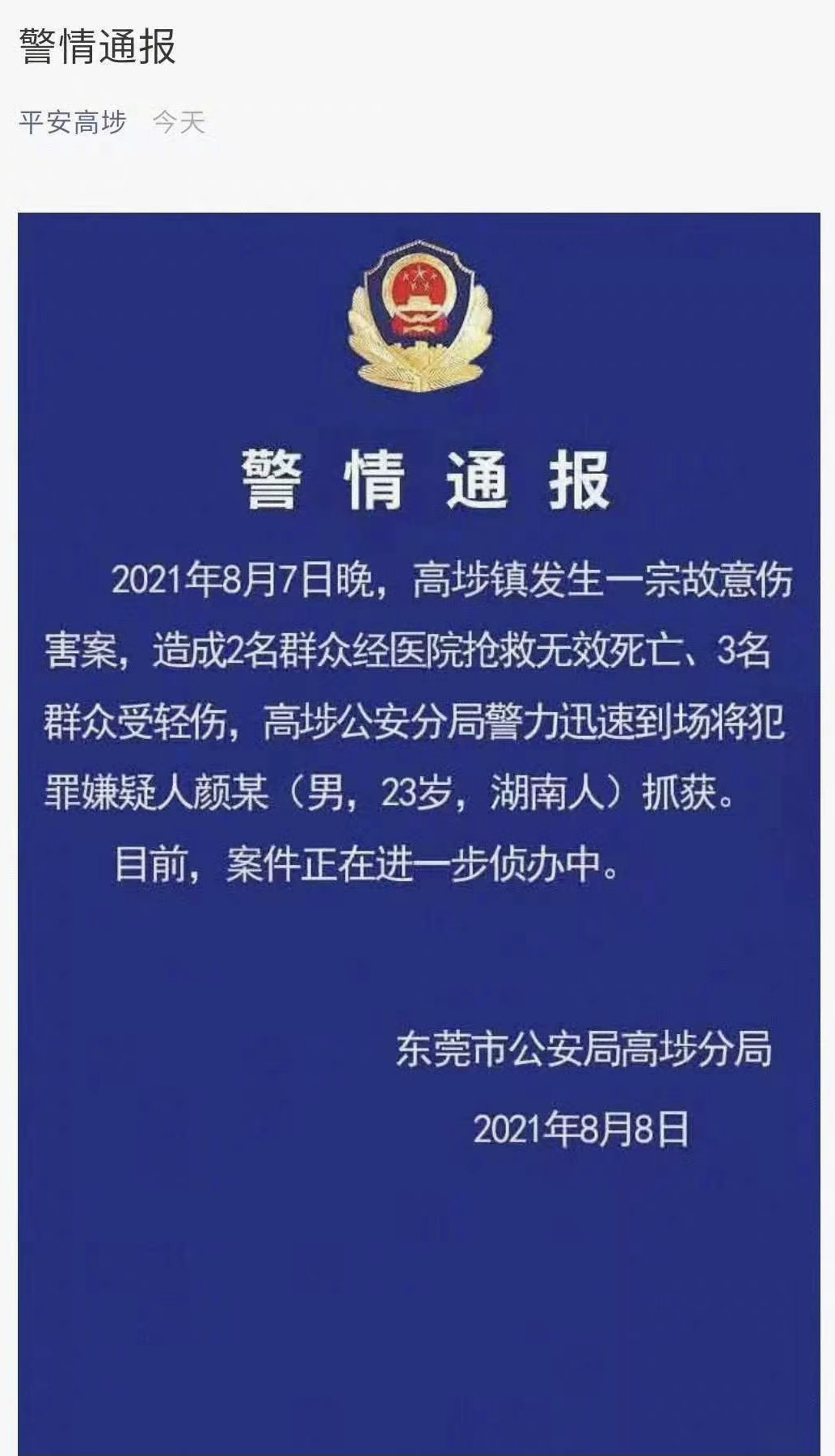 对于此事,广东省东莞市公安局高埗分局发布了通报:2021年8月7日晚,高埗镇发生一宗故意伤害案,造成2名群众经医院抢救无效死亡、3名群众受轻伤,高埗公安分局警力迅速到场将犯罪嫌疑人颜某(男,23岁,湖南人)抓获。