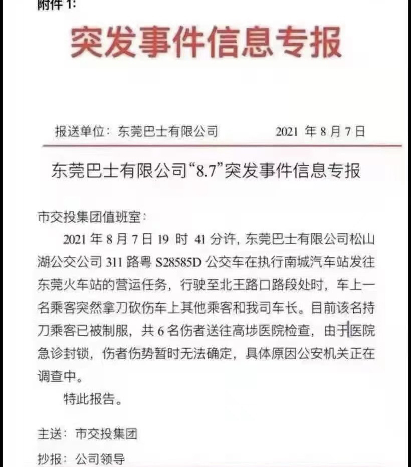 8月7日,一份广东东莞巴士有限公司《“8.7”突发事件信息专报》(下称《专报》)在网上传播。专报中写道,当天晚上19时41分,一名乘客在公交车上,持刀砍伤车长和乘客,6名伤者被送医,警方已接入调查。
