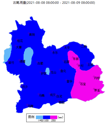 8月8日上午8点至8月9日上午8点,古蔺县普降大雨到暴雨,茅溪、石宝、丹桂、东新、大村大暴雨,茅溪马跃169.7茅溪柏腊152.9石宝142.6丹桂141.7东新119.6大村104.1太平93.8白泥92.8观文88.7皇华场镇84.8德耀80.6龙山鱼丰75.7二郎土城73.7石屏扎山72.8永乐71.9德耀福来71.3龙山71.2箭竹福华70.5石屏69.9皇华金星69.6马嘶68.9彰德红龙湖68.8德耀红光68.2金兰凤田65.7永乐永吉65.2椒园65.1双沙64.4金兰场镇64.2二郎62.9二郎鱼塘58.2黄荆57.6古蔺55.5金兰农场54.4茅溪场镇52.8黄荆桂花51.8,其余站点未达到50毫米。