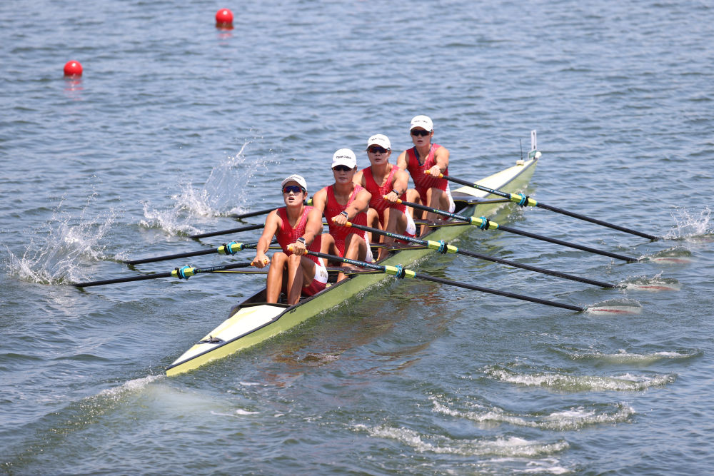 7月23日,中国队选手陈云霞、张灵、吕扬、崔晓桐在女子四人双桨预赛中。