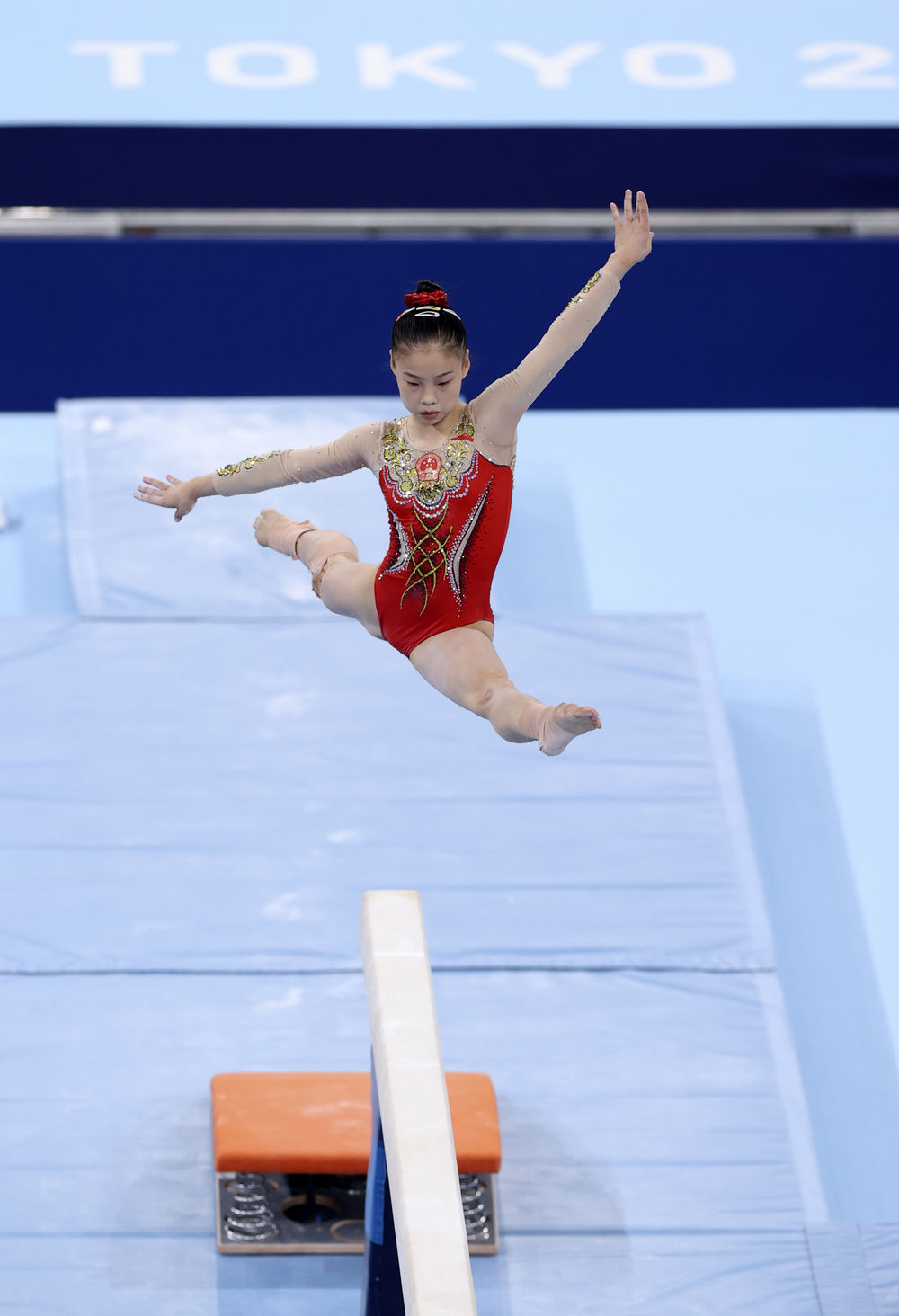 8月3日,我负责拍摄体操项目双杠、平衡木和单杠的决赛。因为中国运动员参加双杠比赛时间在前,所以我无法像其他国家的摄影记者一样提前三个小时就守在平衡木的摄影位置。受疫情影响,场地摄影位置十分有限。在拍摄完中国队双杠项目夺金之后,我来到平衡木场地边,发现已经没有了理想的位置。经过取舍,我走上看台,从高点来拍摄这场平衡木决赛。
