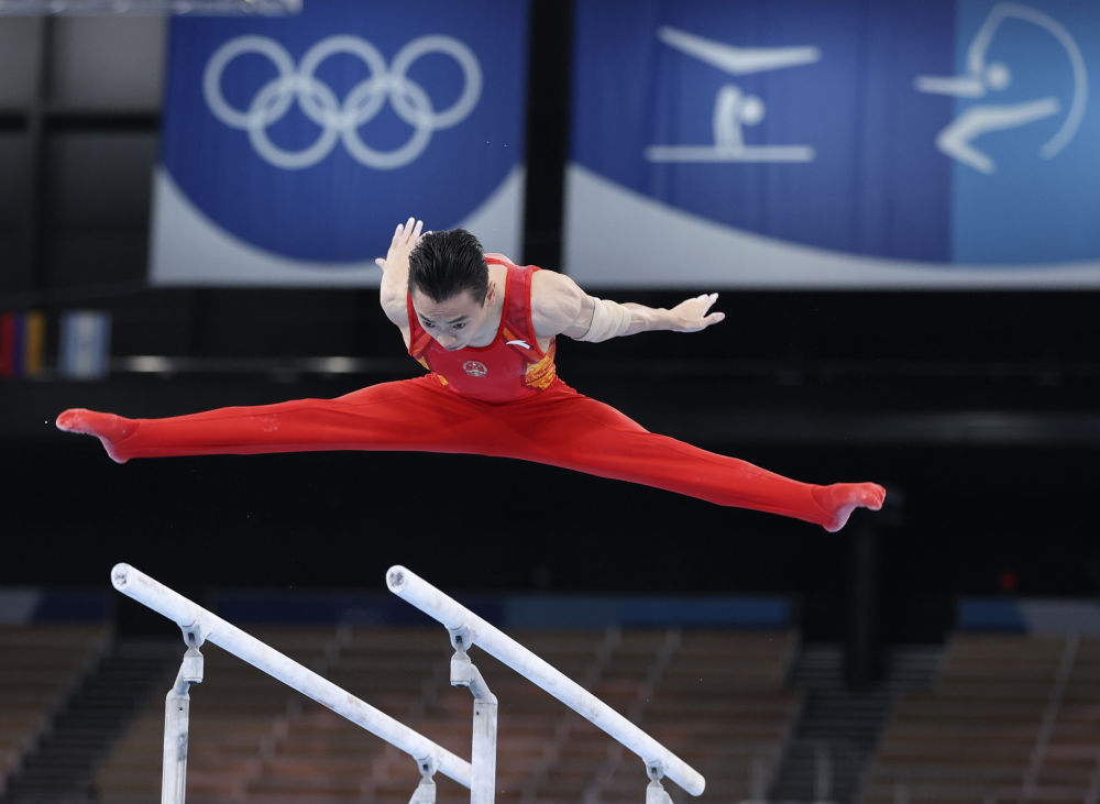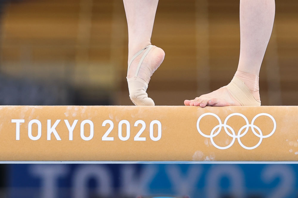 7月22日,日本选手平岩优奈在日本东京有明体操体育馆平衡木上训练。