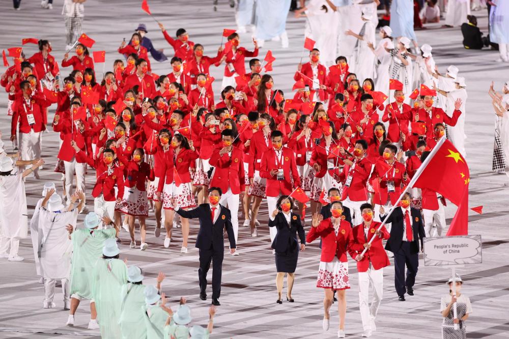 7月23日,第32届夏季奥林匹克运动会开幕式在日本东京举行。这是中国体育代表团入场。