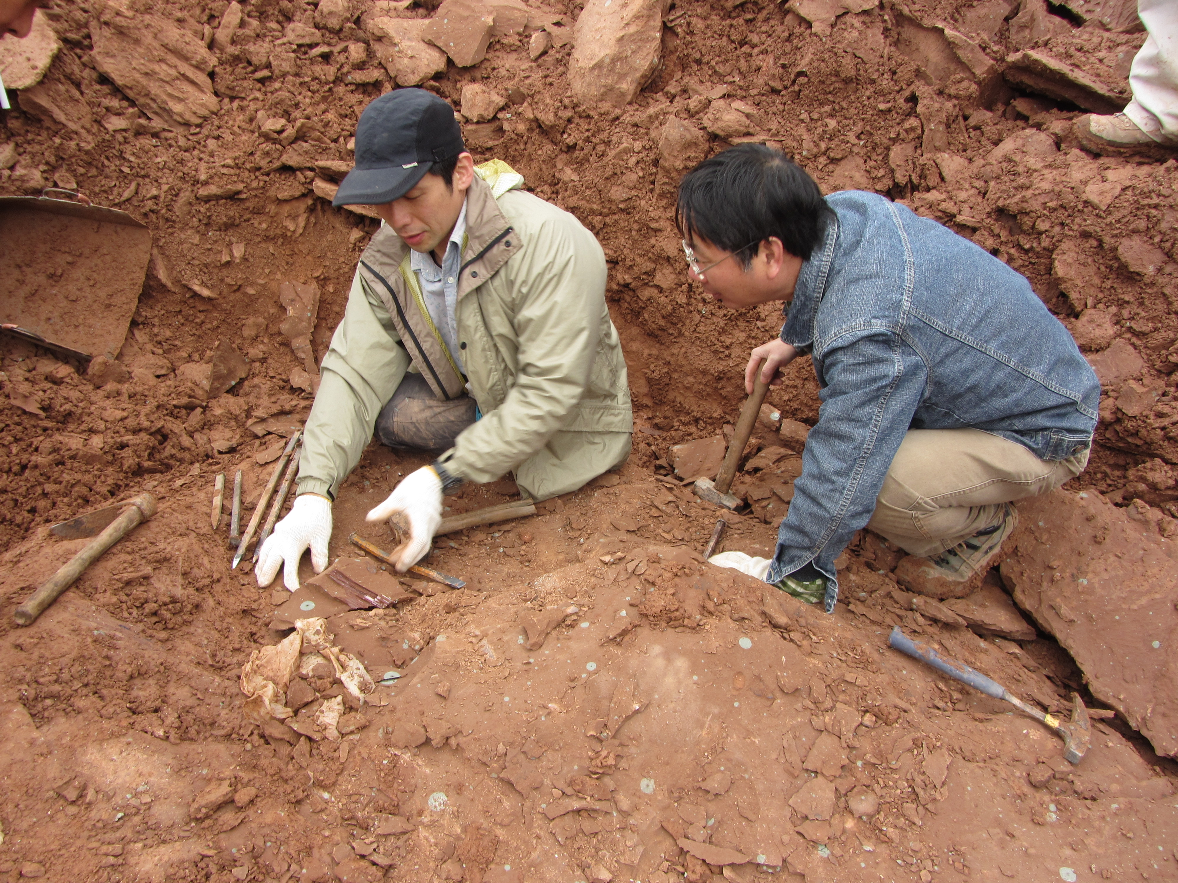 “化石的野外发掘是个由粗到细的过程。”金幸生说,“一开始可以用机器把化石外围的大块岩石切下来,接下来就要像石匠一样,纯手工操作,一点点去凿了。”有的时候,化石在地层里就露出一点儿,下一步往哪个方向挖,如何不伤到化石,靠的全是研究人员的知识积累。