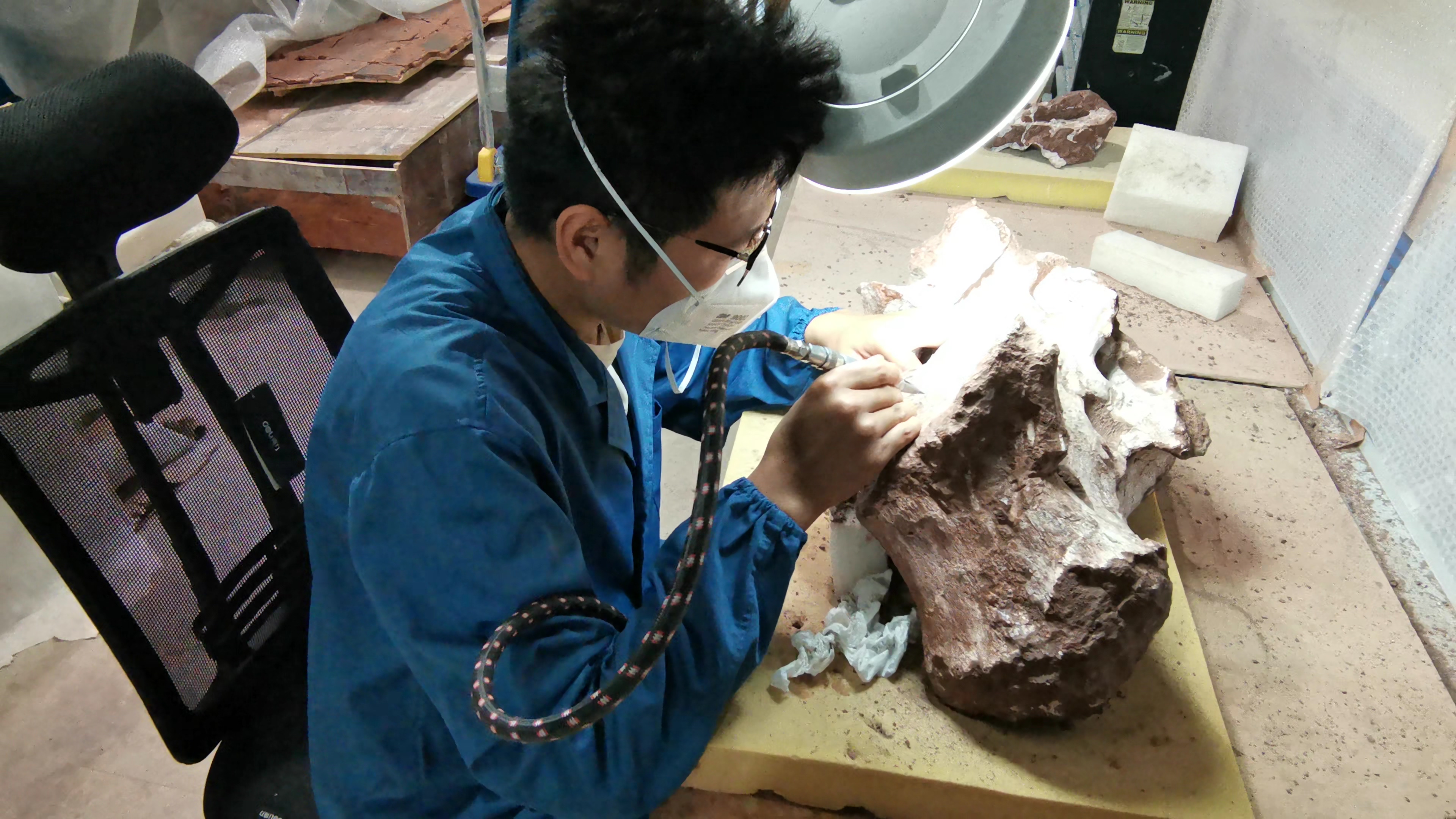 有的恐龙死亡后,遗体被泥沙覆盖,肌肉腐烂后留下骨骼,在漫长的岁月里,骨骼变成化石,和它周围的沉积岩牢固地结合在一起。郑文杰说,恐龙化石修复的主要工作,就是要尽可能多地剥离围岩,让化石呈现出来。