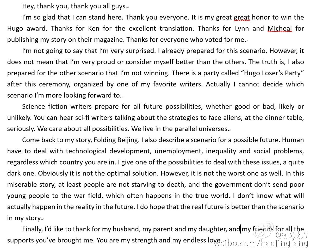宇宙中心时间8月21日,郝景芳出席在堪萨斯举行的颁奖典礼。不同于去年刘慈欣动人的致辞,在当天的获奖感言中除了感谢天(翻译刘宇昆以及给机会发表作品的编辑)感谢地(给她投票的粉丝),清新脱俗的郝景芳还表示获得该奖“她并不吃惊”。