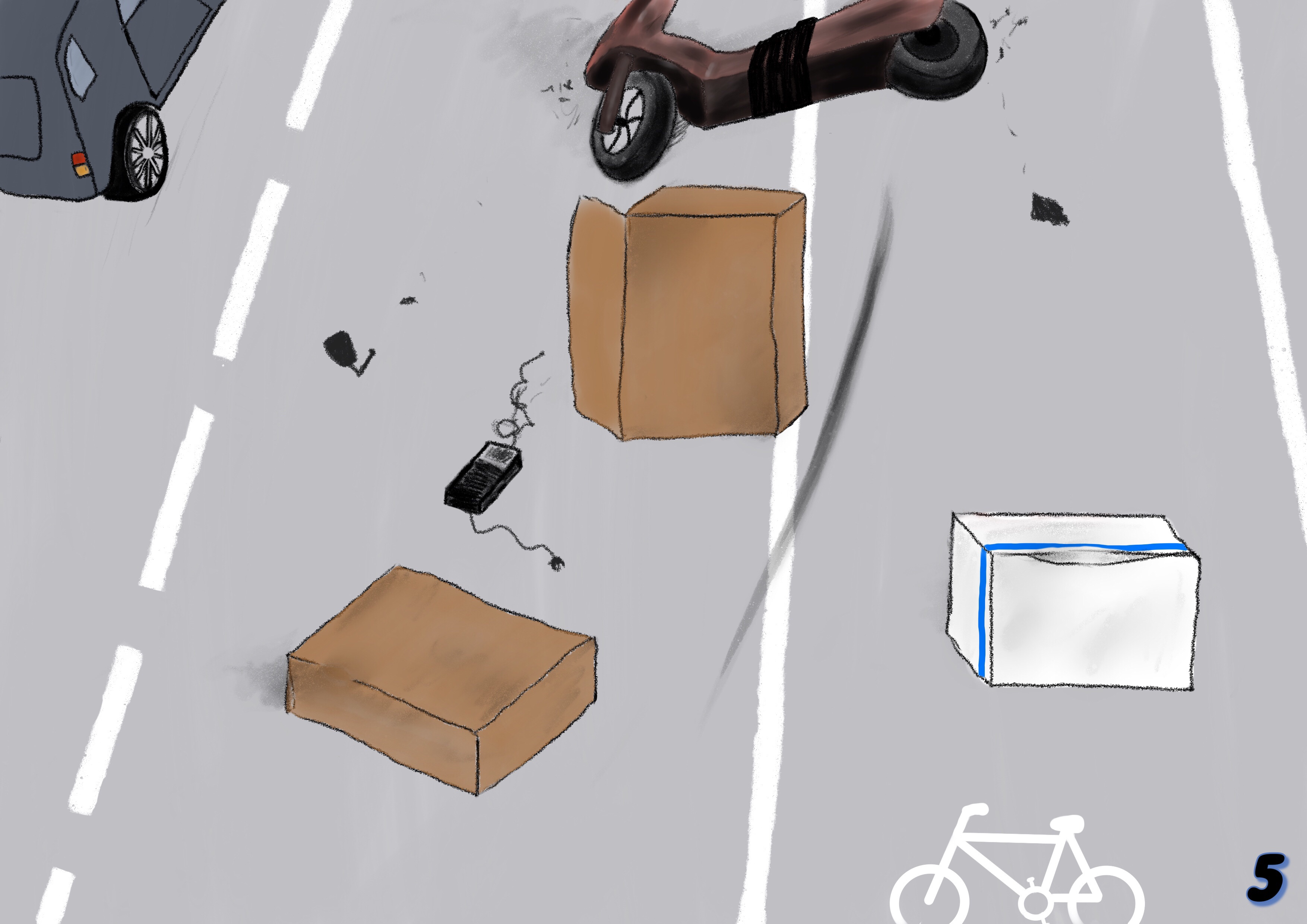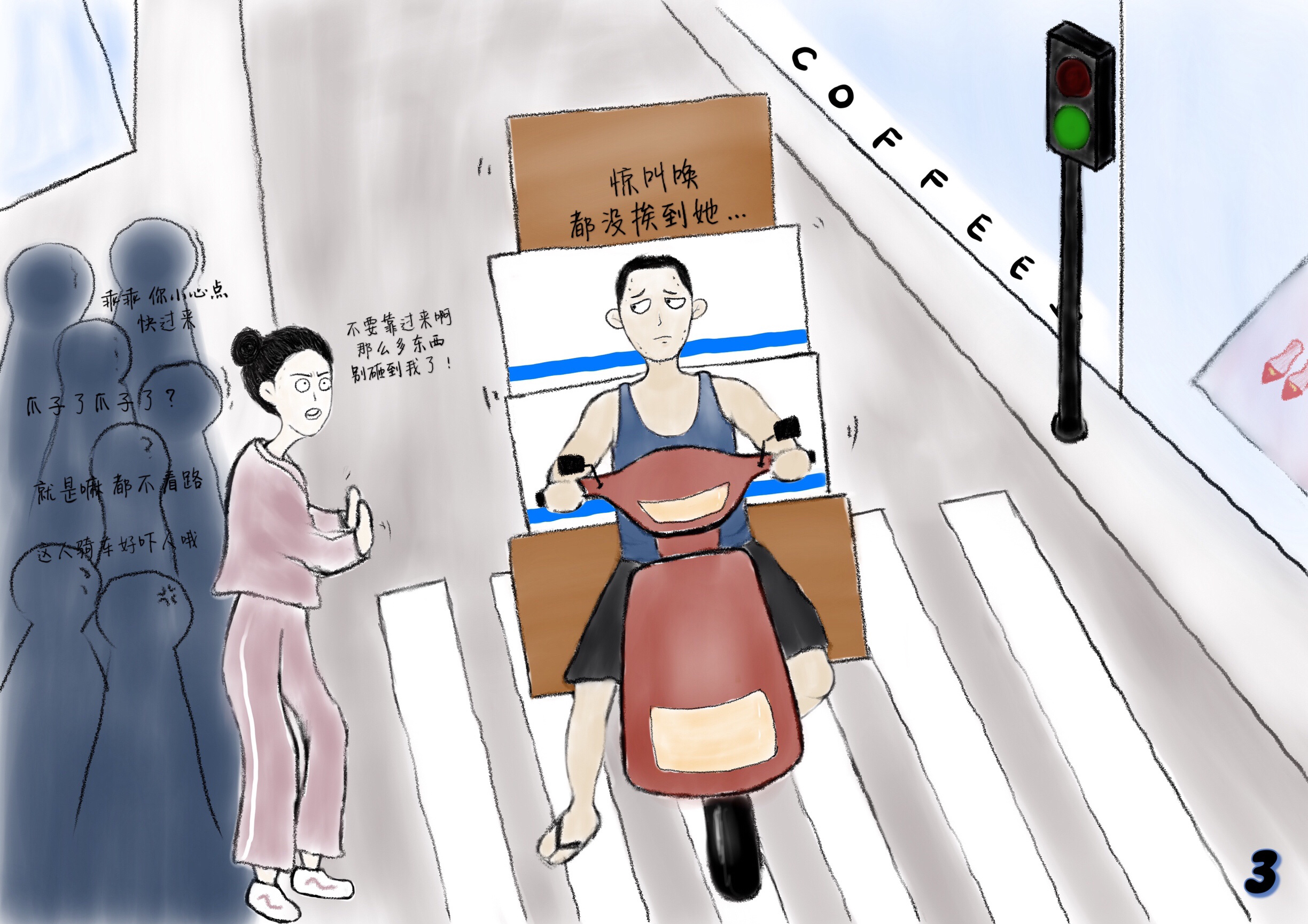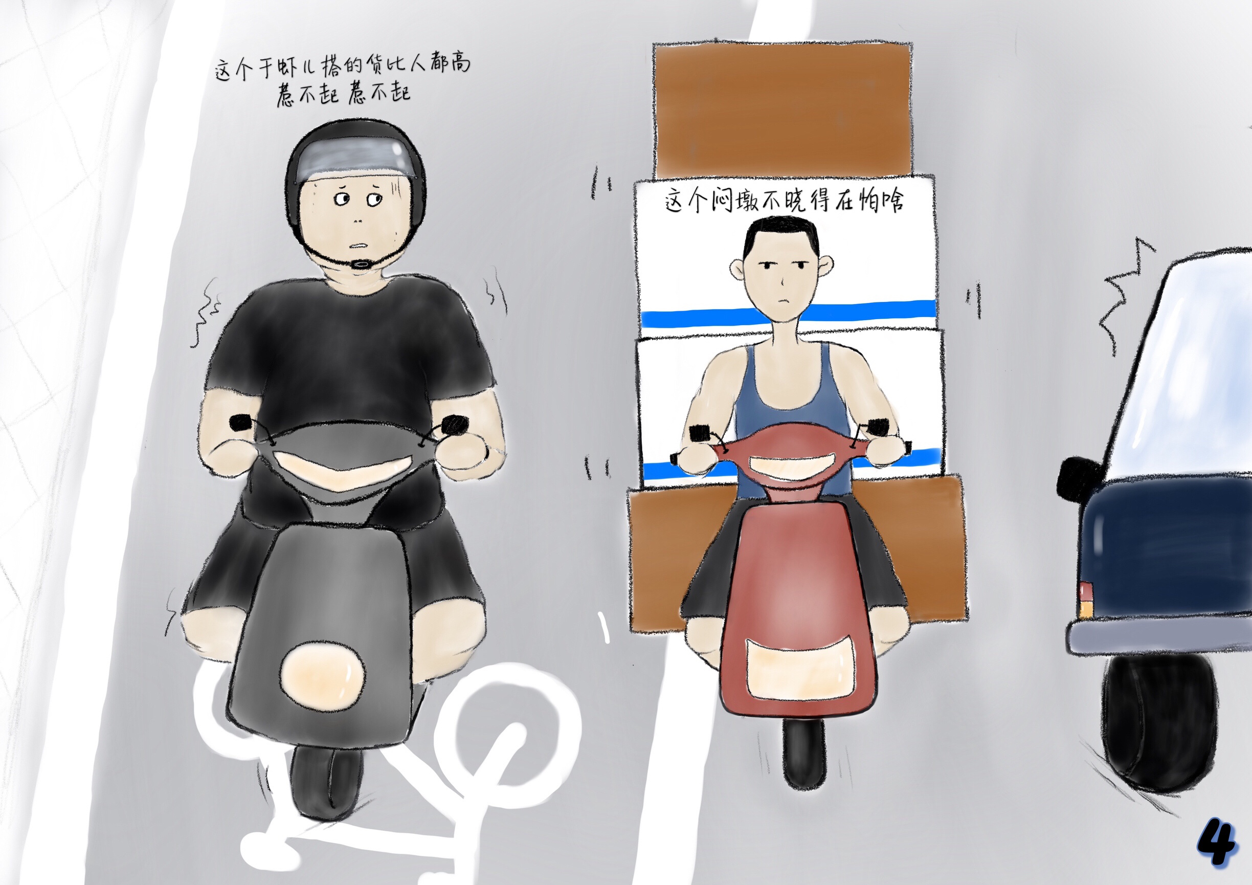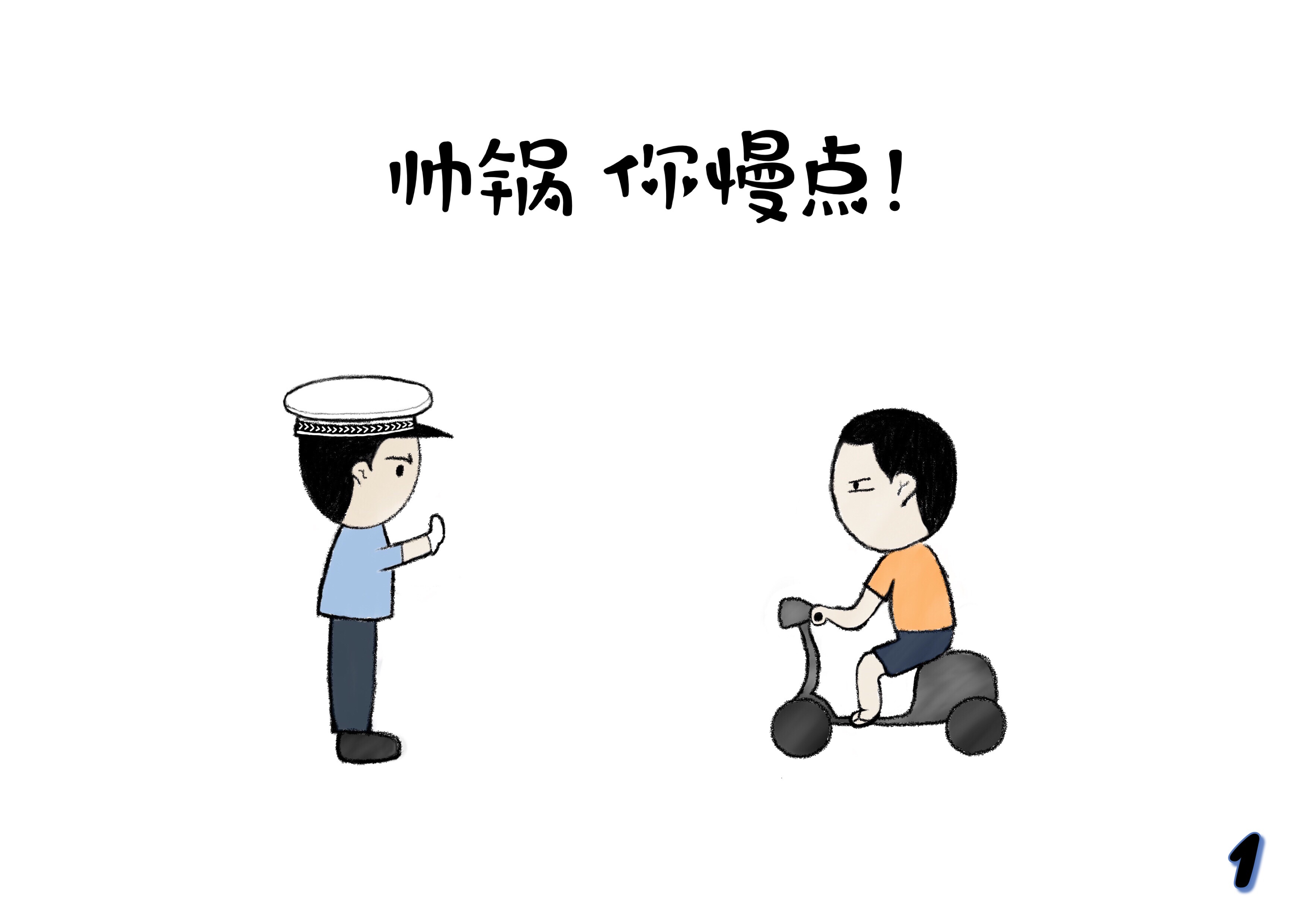 在宣讲的现场,一组名为《帅锅,你慢点!》的漫画引起了记者的注意。漫画描述了一位电动自行车驾驶人,在道路上做出了超载货物、不戴头盔等一系列违反交通法规的行为,对其他的交通参与者构成安全隐患,同时自己也因不遵守交通法规造成了危害后果。