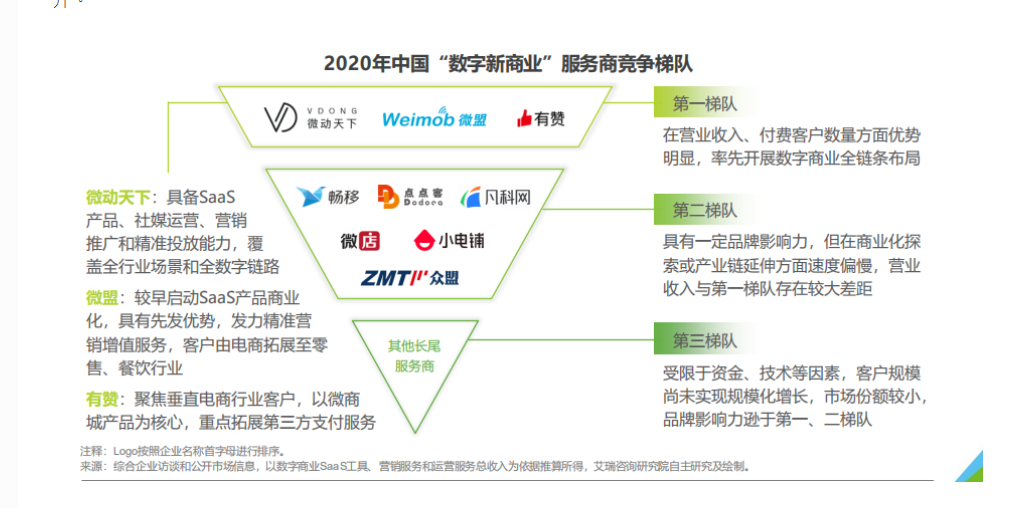 艾瑞咨询发布的《2020年中国数字新商业发展洞察报告》显示,聚焦以数字商业SaaS工具为核心同时提供营销与运营服务的综合服务商,当前的行业竞争格局趋于稳定,头部三家厂商微动天下、微盟、有赞在营业收入、付费客户数量等方面领先优势明显,并基于自身规模效应进一步延伸业务范畴,布局数字商业全链条,占据了大部分的市场份额。第二梯队厂商虽也在行业内有一定的知名度,但在商业化探索上不及第一梯队,差距已逐渐拉开。