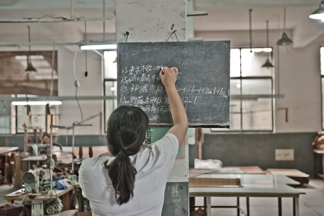 女工在竹凉席生产车间记录技术流程。 受访者供图