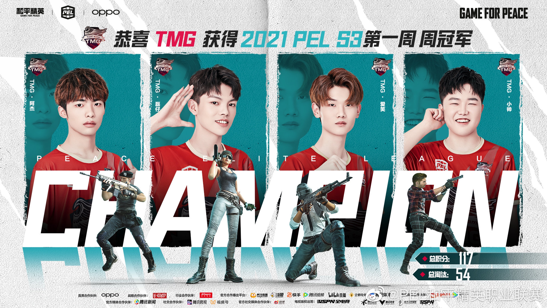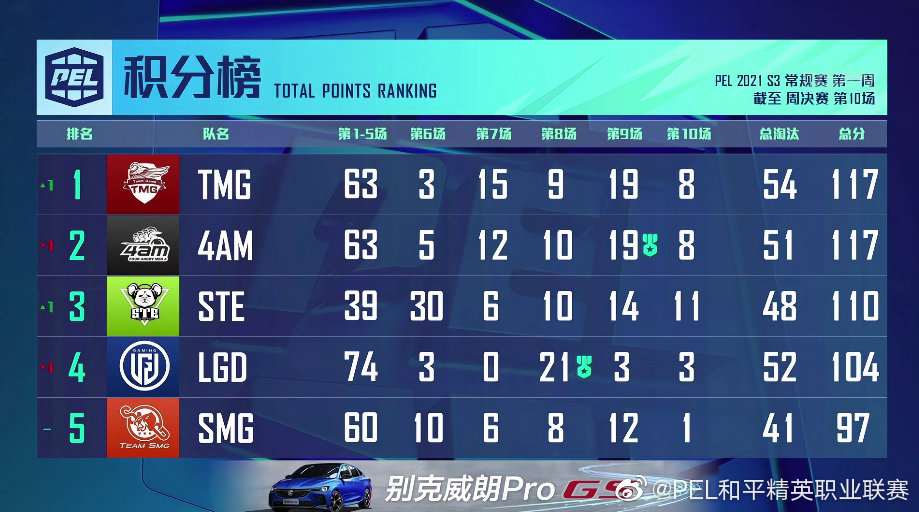 8月22日,2021 PEL S3赛季首个周决赛落幕,TMG战队以117分54淘汰的成绩夺得周冠军,成功拿到100万人民币奖金,这也是他们队史上的首个周冠军。