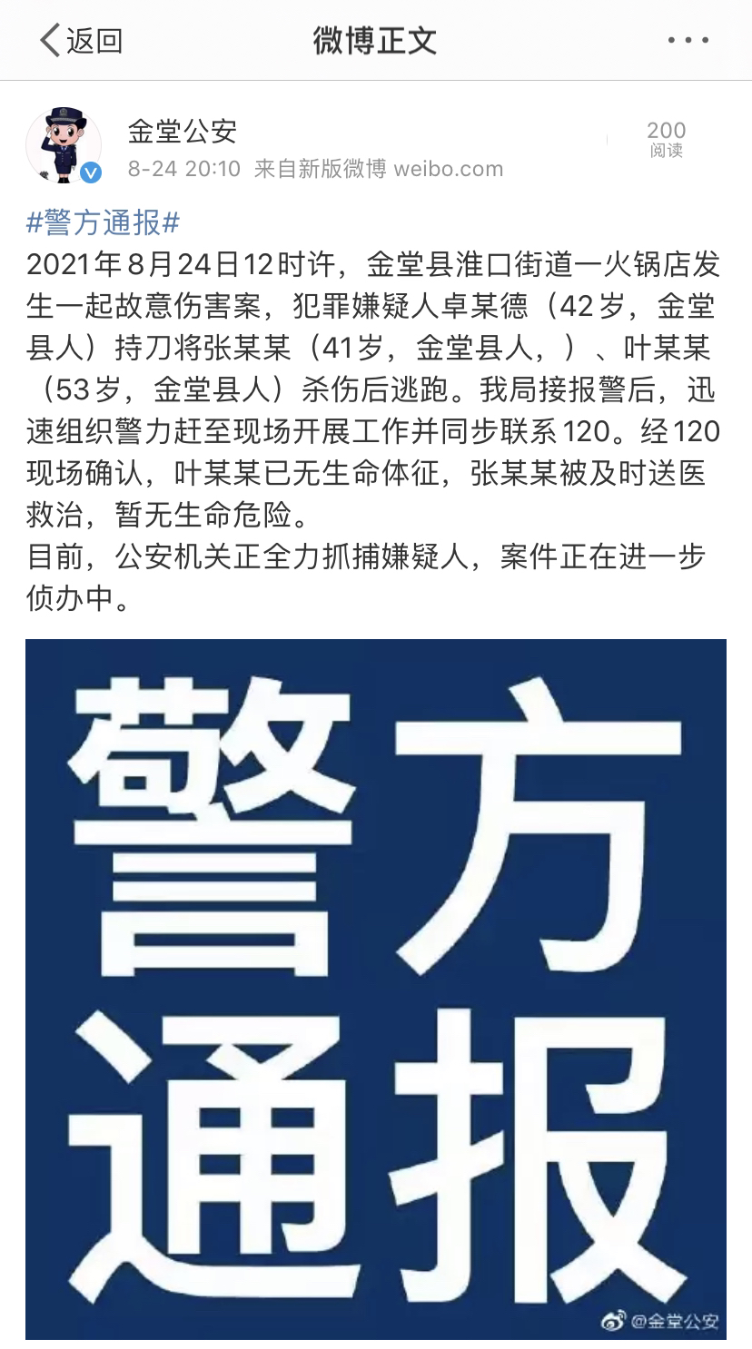 8月24日晚,成都市金堂县公安局通报一起持刀伤人案。通报称,当日中午12时许,金堂县淮口街道一火锅店内,犯罪嫌疑人卓某德持刀将张某某、叶某某杀伤后逃跑。经120现场确认,叶某某已无生命体征,张某某被及时送医救治,暂无生命危险。目前,公安机关正全力抓捕嫌疑人,案件正在进一步侦办中。
