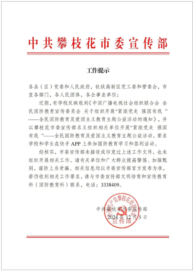 为此,中共攀枝花市委宣传部发布工作提示,市委宣传部未接收或印发过上述工作文件,也未组织开展相关工作。请有关单位和广大群众勿听信谣言,以免受骗上当。(来源:中共攀枝花市委宣传部)