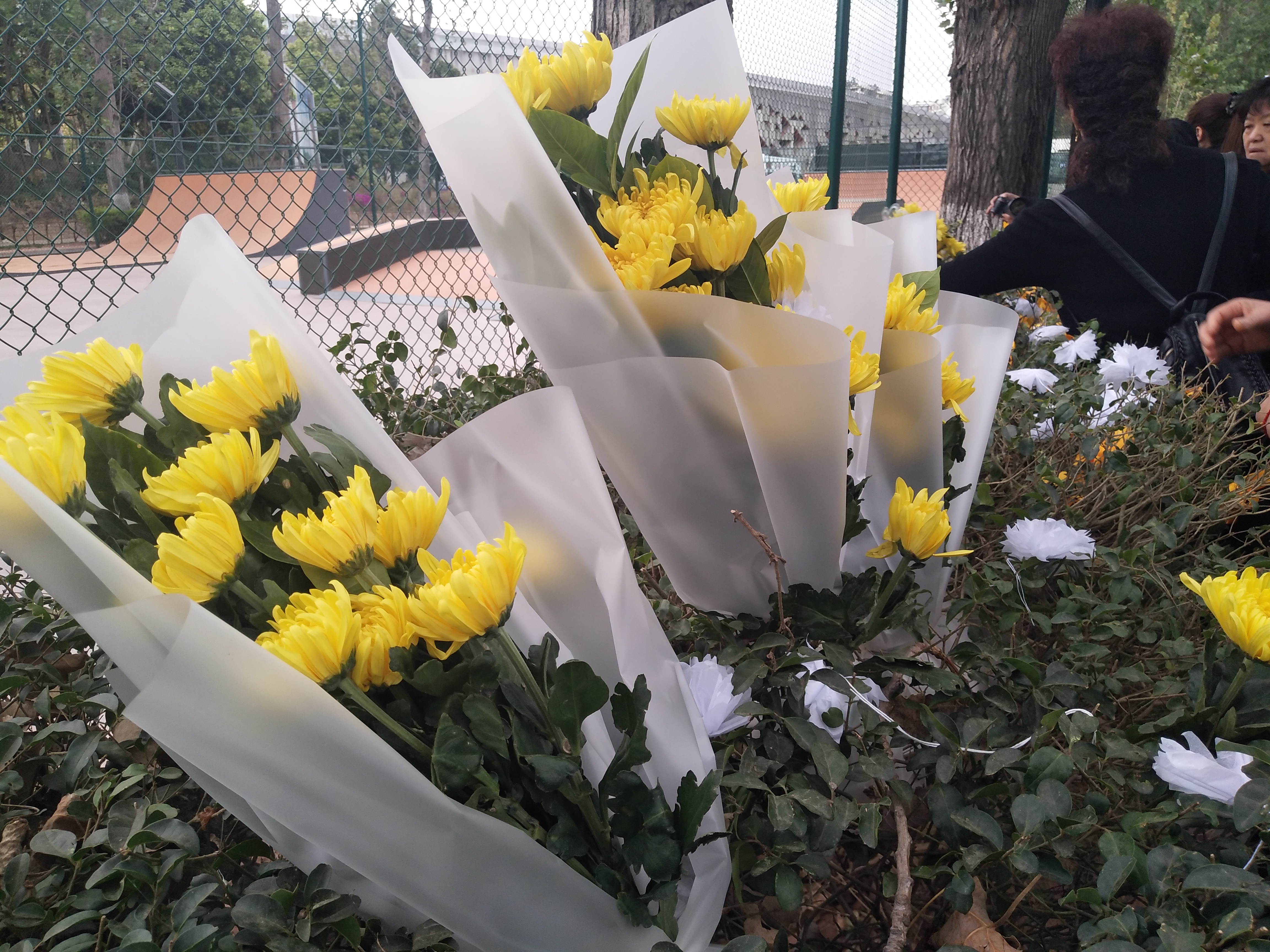 在西昌火把广场外,市民将鲜花放铺在非机动车道,寄托对烈士的深深哀思。