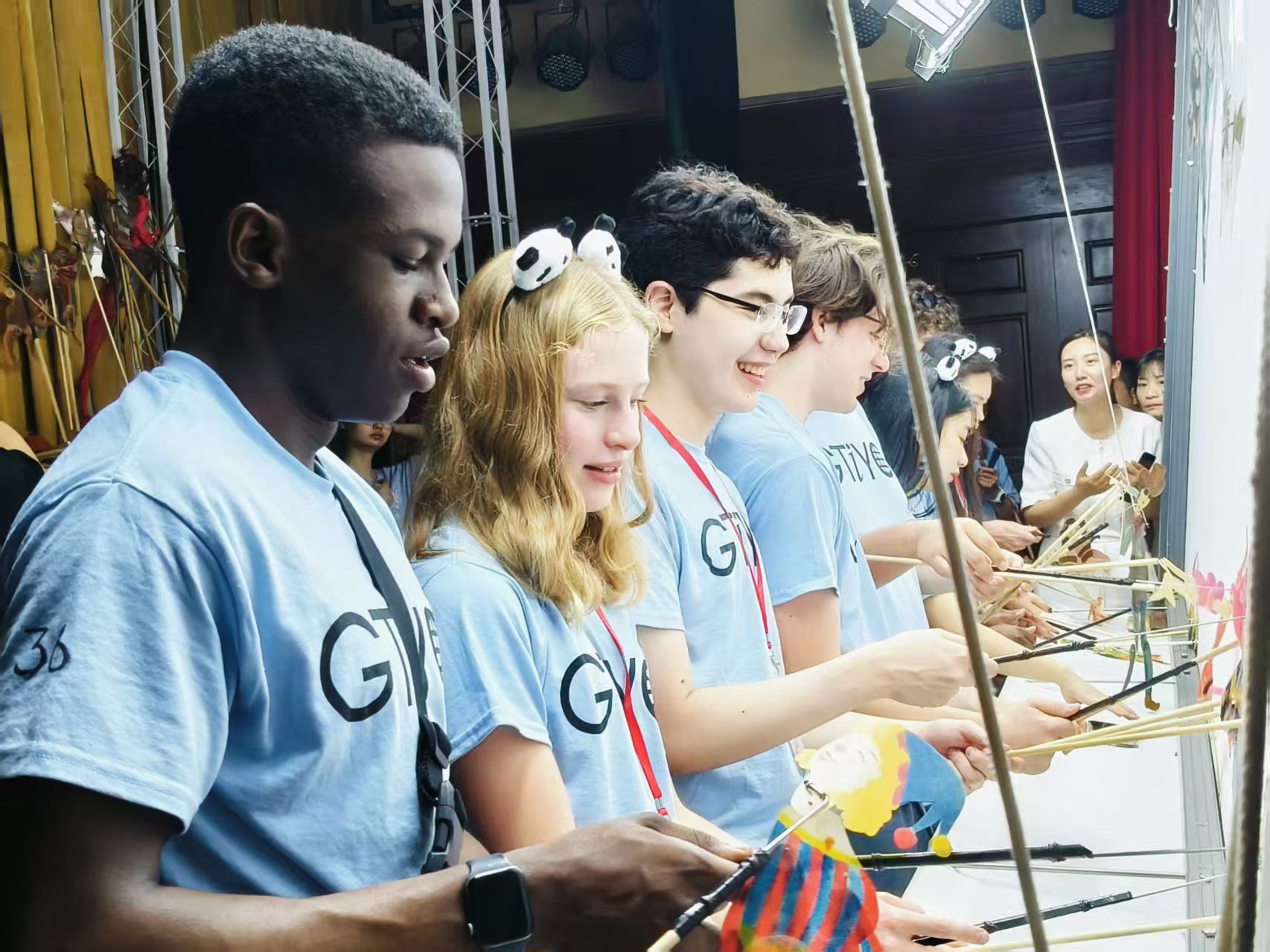 美国大托莱多国际青少年弦乐团成员在川北王皮影博物馆参观体验。(王皮影博物馆供图)