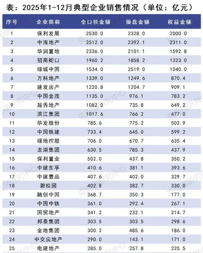 据中指研究院、克而瑞等机构发布的《中国房地产销售额排行榜榜单》来看,2025年,保利发展蝉联销冠,与绿城中国、中海地产、华润置地、招商蛇口位居前五位,而万科则跌出前五。