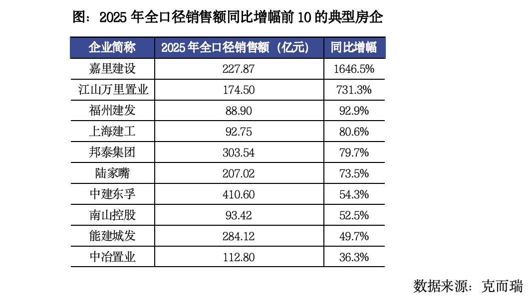 在克而瑞发布的2025年1-12月典型企业销售情况表中,可以看出,2025年典型房企中累计业绩同比增长企业共有24家,其中同比增幅大于30%的企业数量有12家,部分企业业绩大幅回暖,例如嘉里建设同比增幅达1646.5%,江山万里置业同比增幅达731.3%。