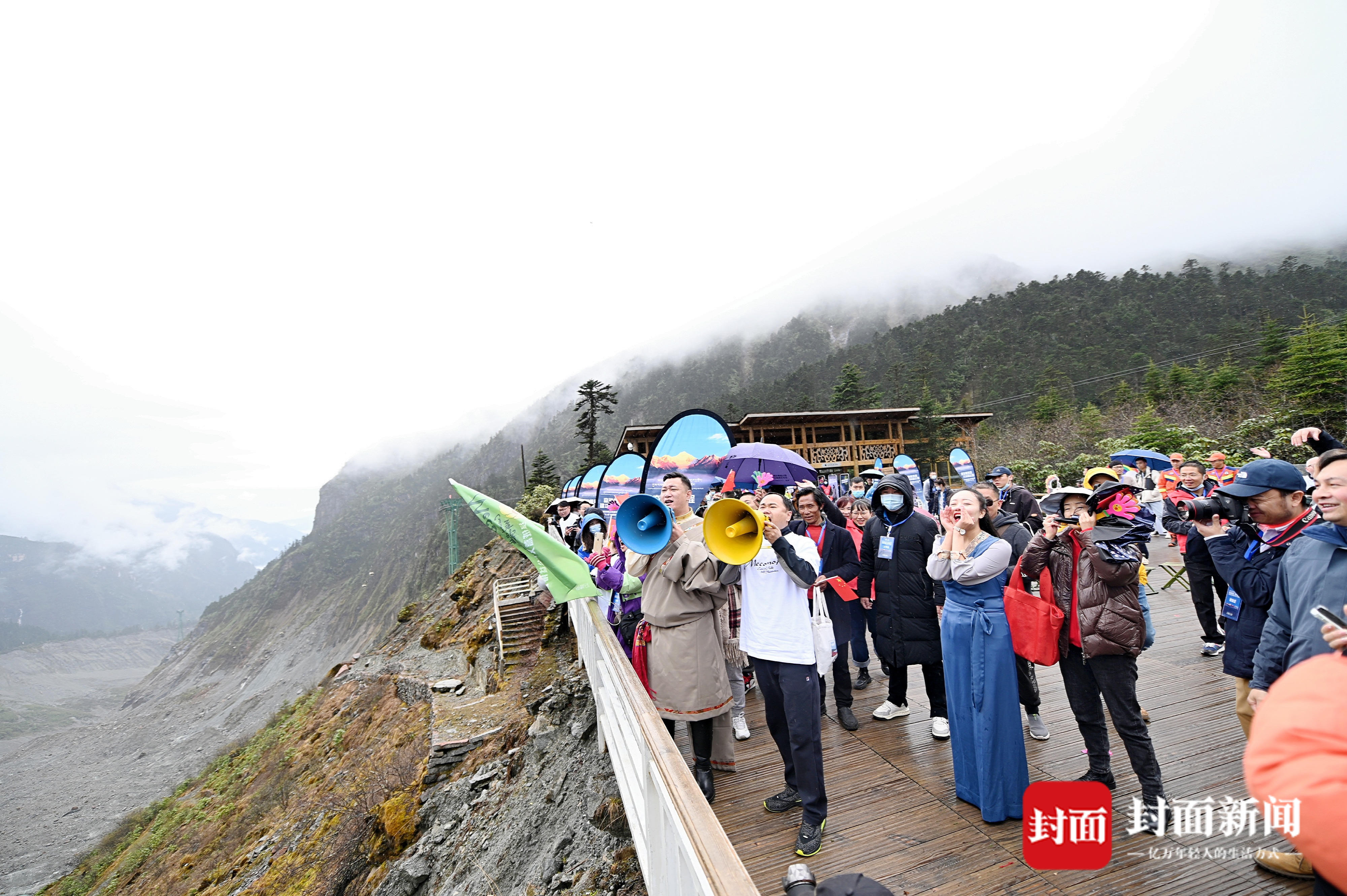 游客在面向海螺沟一号冰川,高喊对家人、朋友和祖国的祝福。