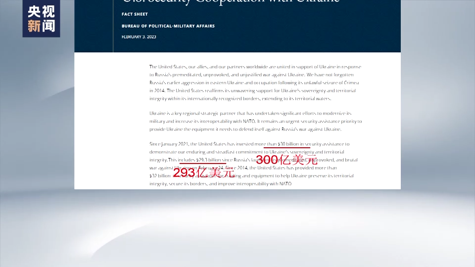 2月3日,美国国务院公布清单显示,自2022年2月俄乌冲突爆发以来,美国已批准的对乌克兰军事支持总额达到了293亿美元。而从2021年1月算起,美国对乌克兰的军事支持总额约为300亿美元。
