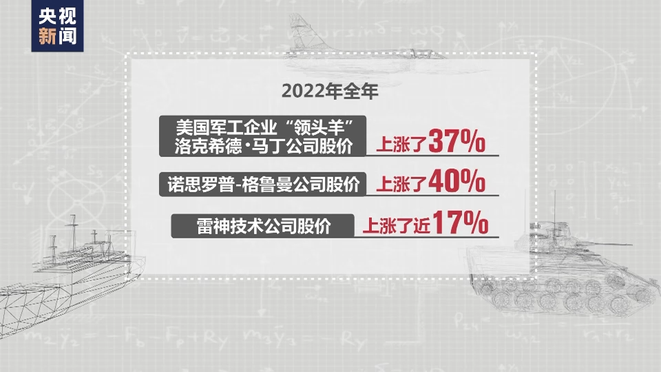 激增的军火订单令美国军工巨头的股价飙升。2022年全年,美国军工企业“领头羊”洛克希德·马丁公司股价上涨了37%,诺思罗普-格鲁曼公司股价上涨了40%,雷神技术公司股价上涨了近17%。
