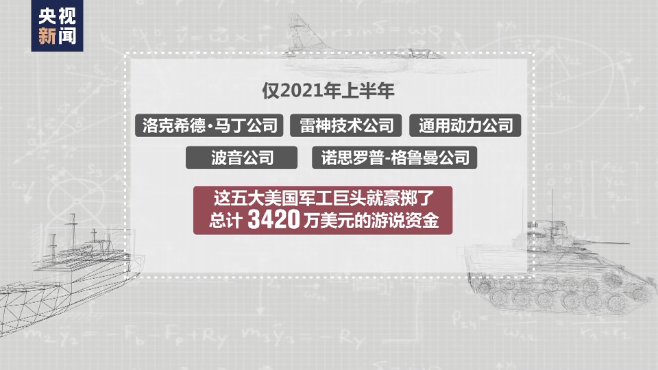 统计数据显示,仅2021年上半年,洛克希德·马丁公司、雷神技术公司、通用动力公司、波音公司和诺思罗普-格鲁曼公司这五大美国军工巨头就豪掷了总计3420万美元的游说资金。美国布朗大学一项研究表明,过去二十年间,美国军工企业在游说政客上花费高达25亿美元。