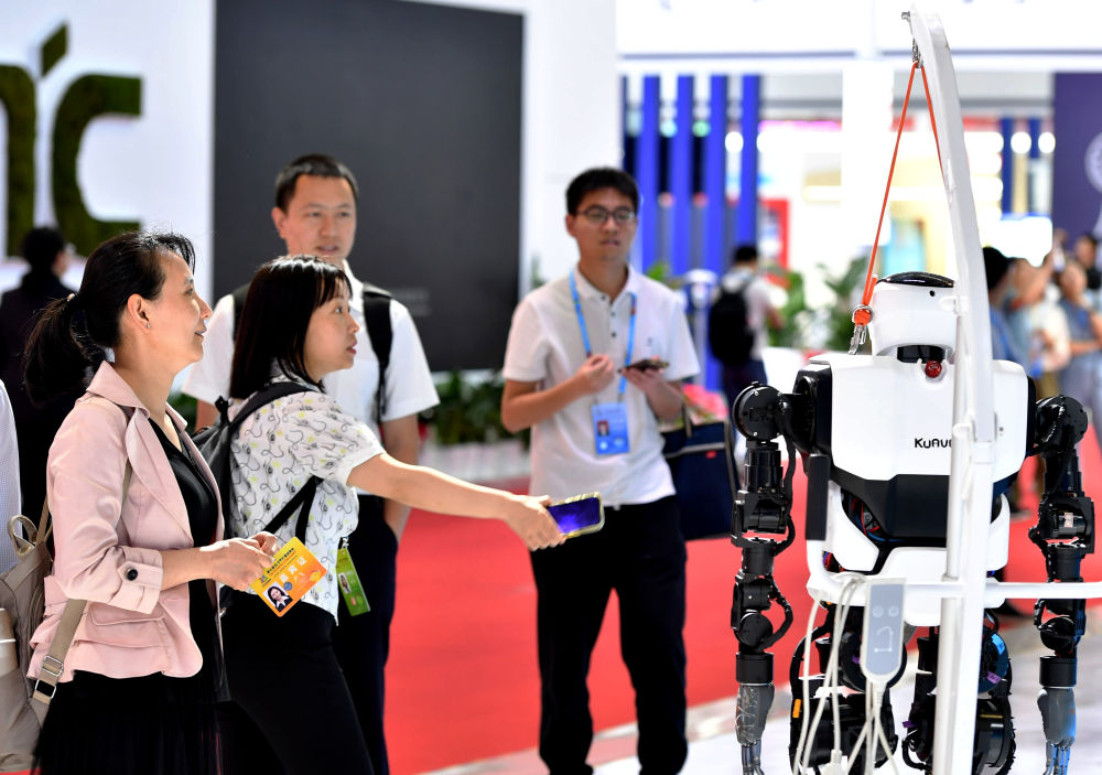 5月24日,在第七届数字中国建设峰会现场体验区,观众在观看“移动爱家机器人”。新华社记者魏培全摄