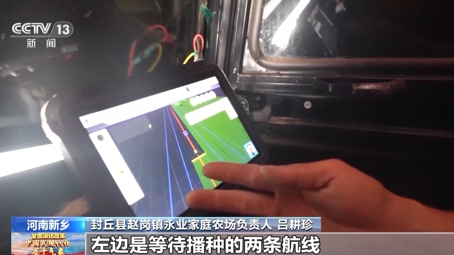 河南新乡封丘县赵岗镇永业家庭农场负责人 吕耕珍:我双手已经解放了,不用再去手把着方向盘,担心后面播种弯弯曲曲的了。右边是已经播种过的,左边是等待播种的两条航线,这个航线它会自动地无限生成,土地的利用率更加精准了。