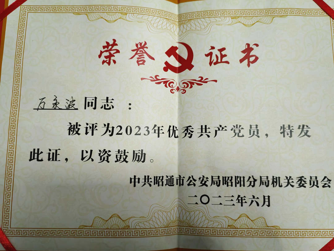 今年6月,万永波获得昭通市公安局昭阳分局“优秀共产党员”称号。 罗丹 摄