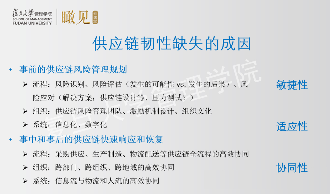 在复旦管院“瞰见”云课堂,复旦大学管理学院管理科学系教授冯天俊就“如何打造震荡中的供应链”,为大家详解供应链风险管理、供应链韧性的构建。