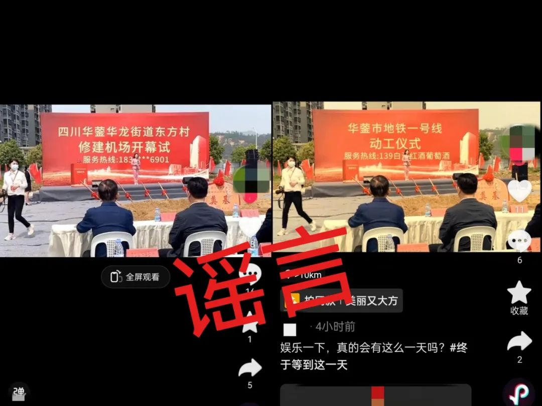 华蓥杜某某、程某某编造“修建机场、地铁”网络谣言案。2024年4月21日,杜某某、程某某为吸引流量、博取关注,使用剪辑软件生成虚假视频,在某网络平台上发布“四川华蓥华龙街道东方村修建机场开幕式”“华蓥市地铁一号线动工仪式”的不实信息,引发网民热议,造成不良社会影响。目前,杜某某、程某某已被公安机关行政处罚。