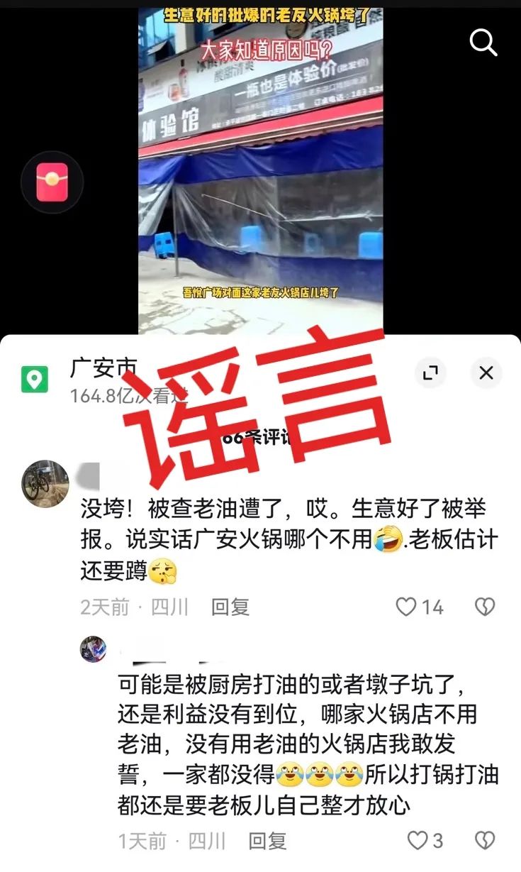 经开区刘某编造“火锅老板因被查老油遭了”网络谣言案。2024年4月11日,刘某为吸引他人眼球,在某短视频“广安老友火锅关门”的作品评论区发布不实言论谎称“没垮,老板因为被查老油遭了,估计还要蹲”,引发网民关注,造成不良社会影响。目前,刘某已被公安机关行政处罚。