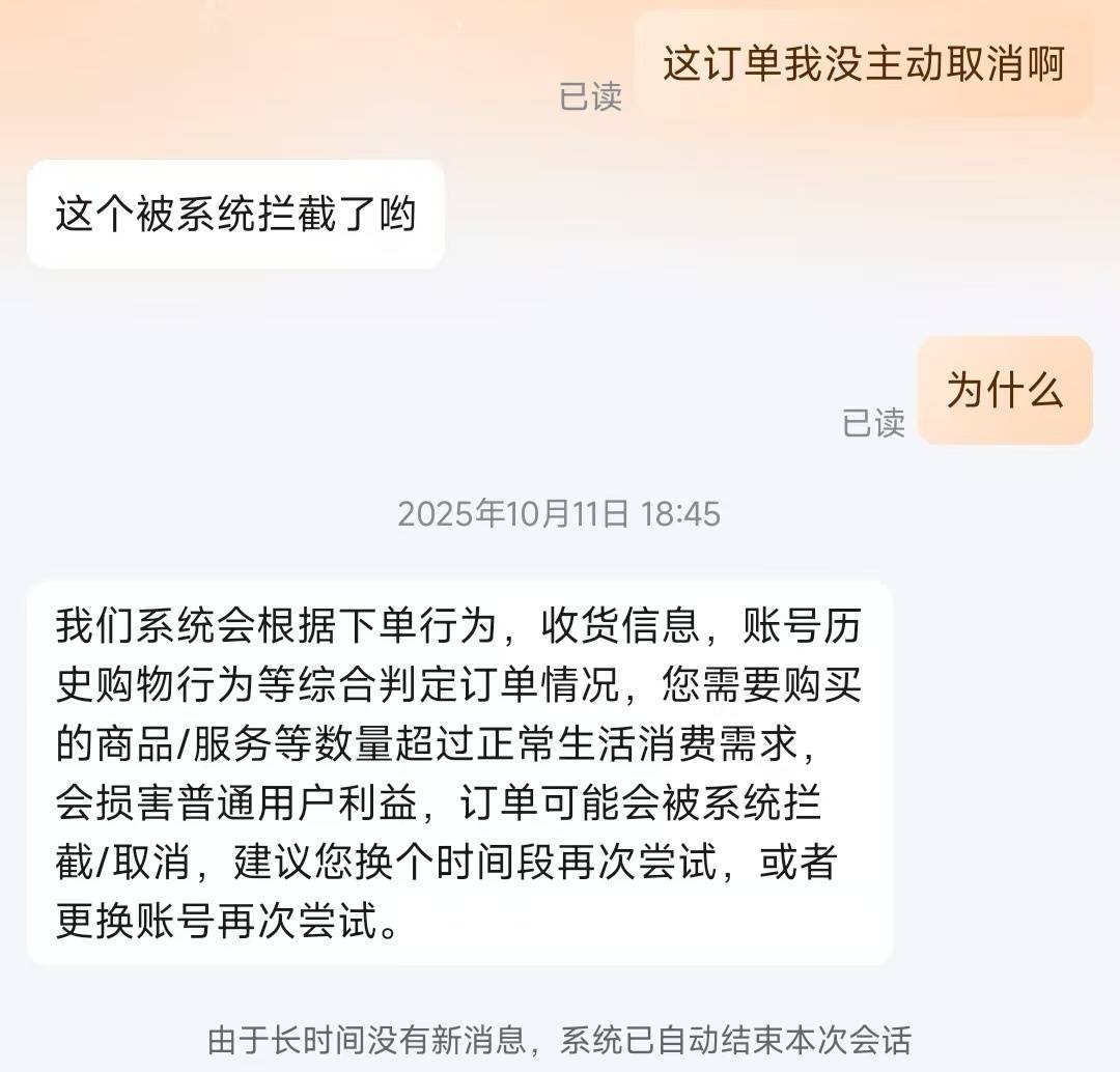 郑先生表示,他第一时间联系商家,对方表示无权取消订单,建议他联系平台客服。平台方回应称,系统会综合评估下单行为、收货信息及账户历史购物记录等,若购买数量“超出正常生活消费需求”,可能影响普通用户利益,订单即可能被拦截或取消。