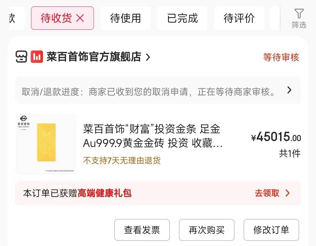 10月10日,郑先生在某电商平台购入50克黄金,单价约900元/克,总价4.5万元。11日,订单显示商品已进入派送阶段,却被平台锁定拦截,最终单方面被取消。“看到订单突然没了,我整个人都懵了。”10月16日晚,郑先生向记者讲起此事时仍感无奈。