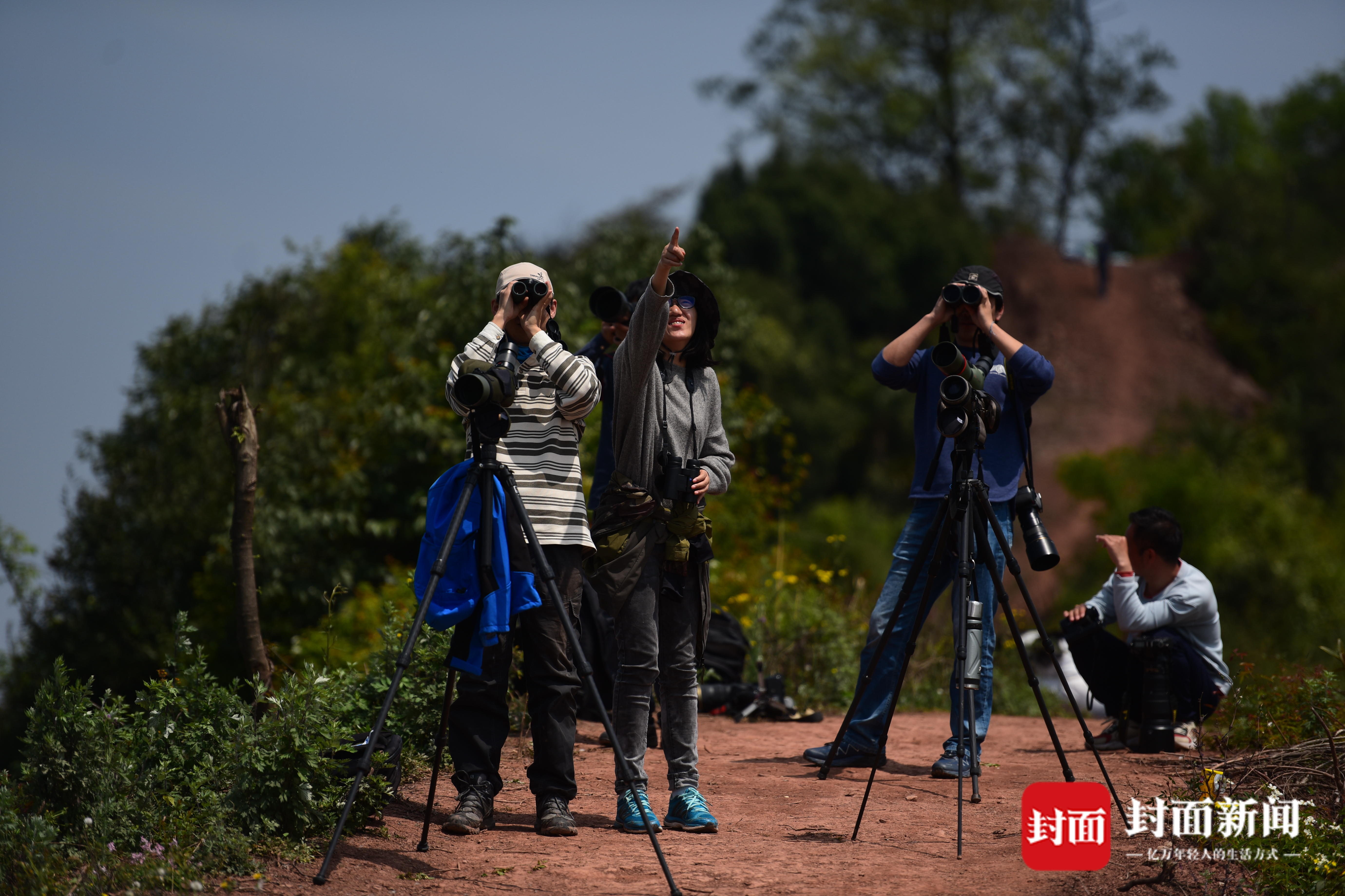 观鸟爱好者在龙泉山上观察猛禽迁徙