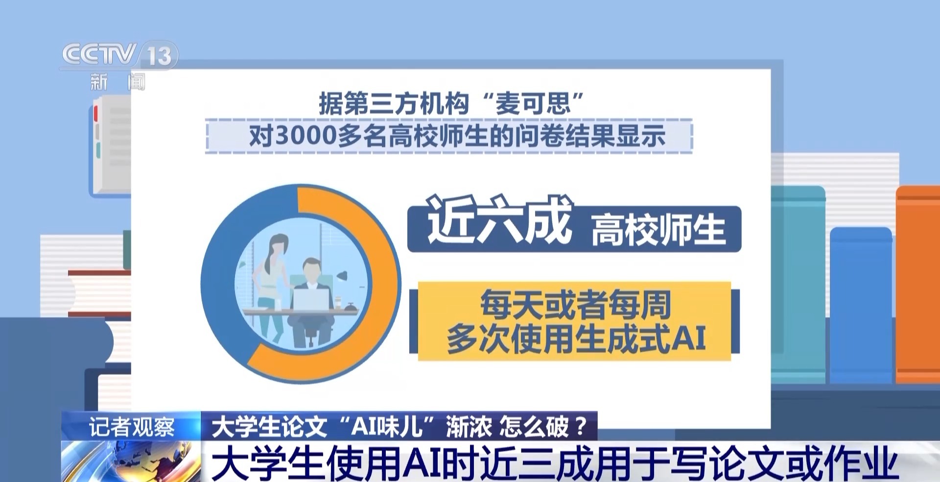 据第三方机构“麦可思”对3000多名高校师生的问卷结果显示,近六成高校师生每天或者每周多次使用生成式AI。而大学生在使用生成式AI时,有近三成主要用于写论文或作业。采访中,一些学生也坦言,在写报告或论文时,他们会直接复制粘贴AI生成的内容。