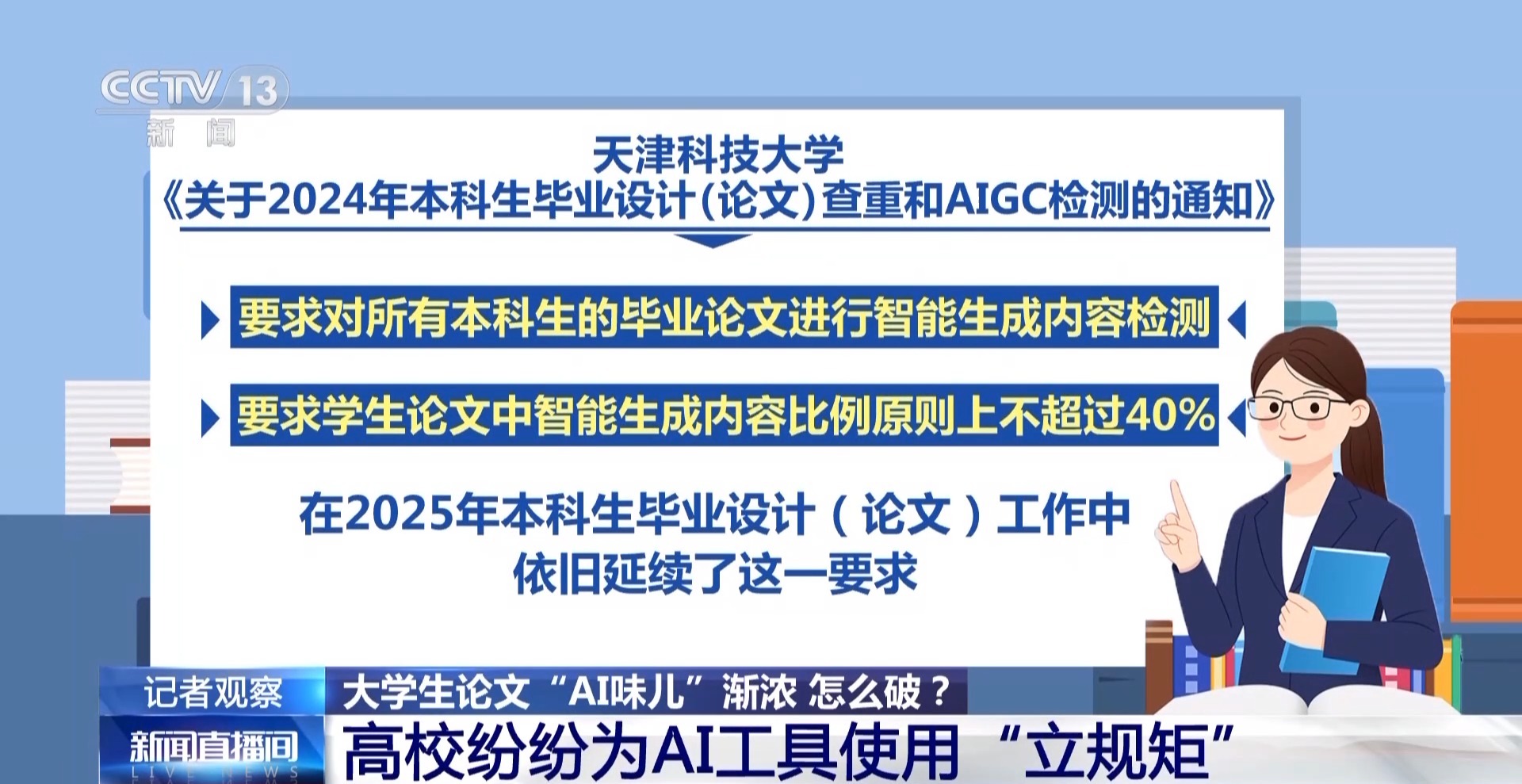 天津科技大学去年发布了《关于2024年本科生毕业设计(论文)查重和AIGC检测的通知》,要求对所有本科生的毕业论文进行智能生成内容检测。要求学生论文中智能生成内容比例原则上不超过40%。在2025年本科生毕业设计论文工作中,依旧延续了这一要求。
