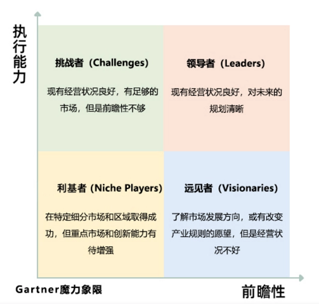 据了解,“全球云数据库管理系统魔力象限报告”主要从云厂商的“执行能力”以及“愿景完整度”共计两大维度的多个方面进行考察分析。其中,执行能力评估标准包括产品或服务、总体生存能力、销售执行/定价、市场响应能力/记录、营销执行、客户体验与操作等指标;愿景完整度评估标准包括市场策略、销售策略、商业模式、创新能力等指标。最终将全球筛选出来的前20名供应商划分到领导者、远见者、挑战者和利基者四个象限中;其中,横轴表示前瞻性,纵轴表示执行能力。