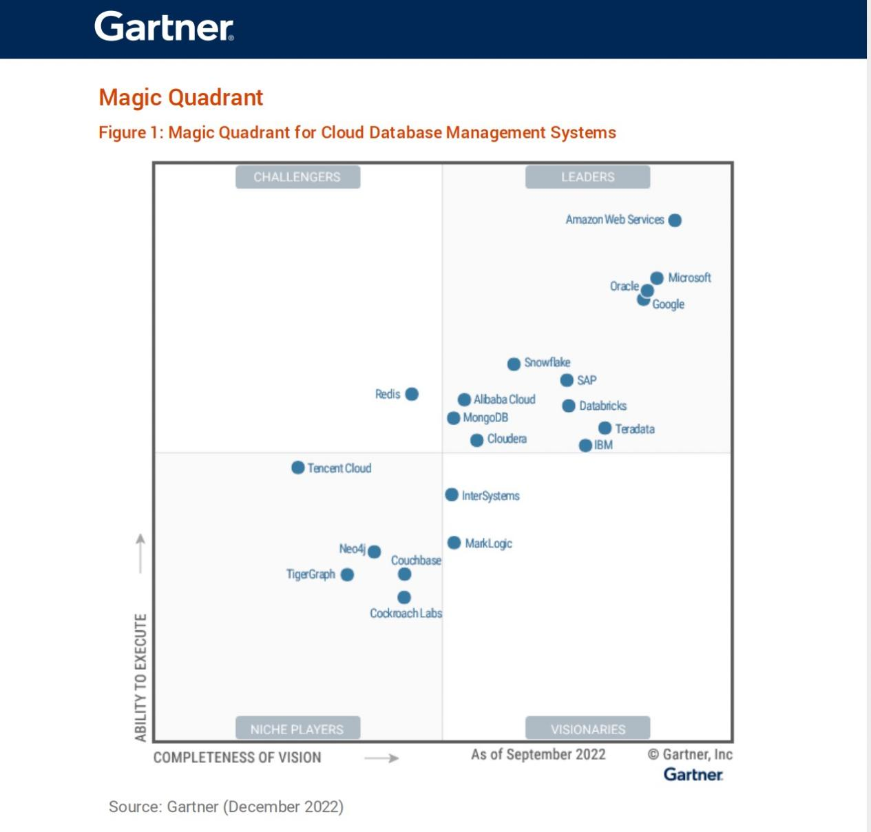 近日,国际市场研究机构Gartner发布了《2022年度全球云数据库管理系统魔力象限报告》,报告显示,亚马逊云、微软、甲骨文等云服务商均进入领导者象限,其中,亚马逊云凭借在执行能力轴和前瞻性轴上的表现,拉开了与其它竞争对手的距离。在中国云厂商中,阿里云是唯一一家处于领导者象限的中国厂商。